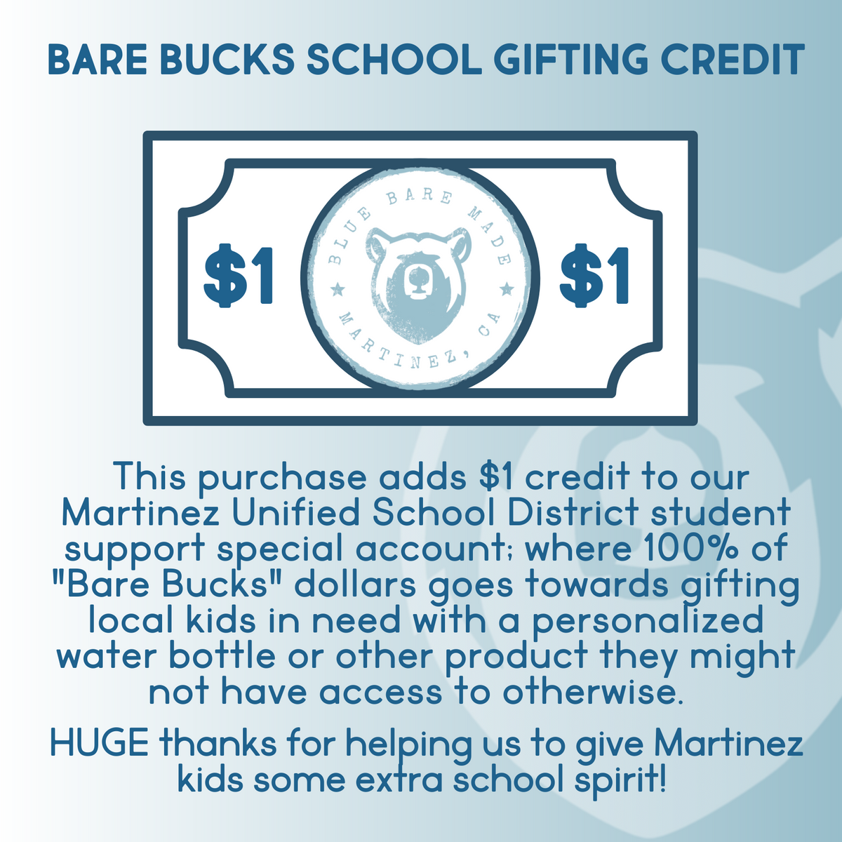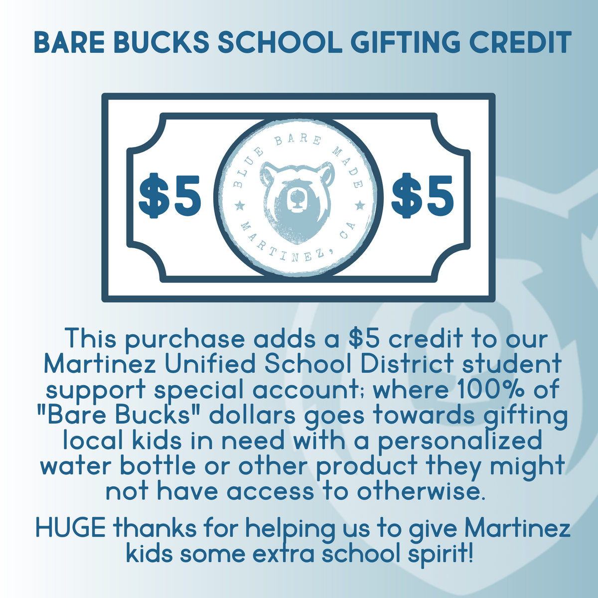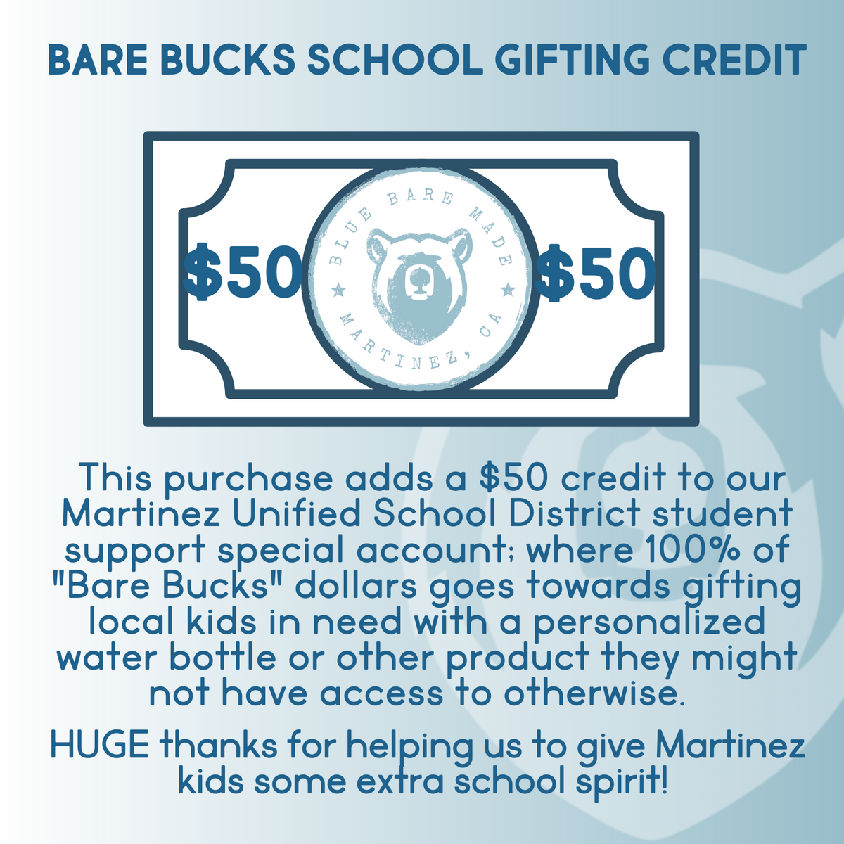 There are students in every Martinez Unified school who's families are experiencing a hardship and are unable to purchase speciality school merchandise. With your help, we at Blue Bare Made can discreetly provide a personalized water bottle or other needed item to students who may not have access otherwise.
