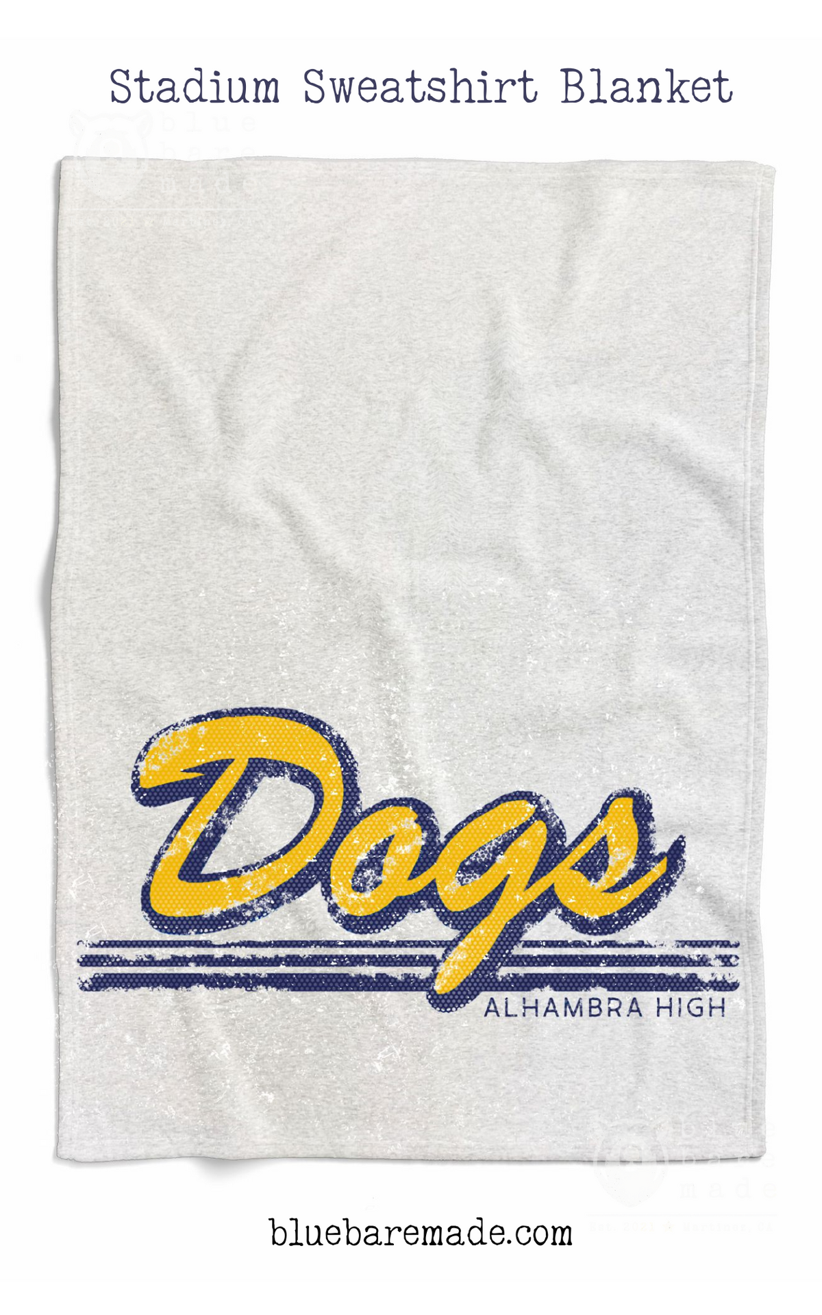 - Base color of the blanket is an ash gray with the Blue Bare Made / Alhambra High Dogs collaboration logo printed in gold and dark blue