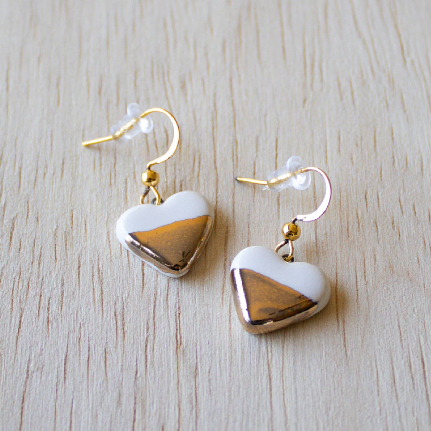 Ceramic Earrings | White and Gold Dangle Hook Small Hearts