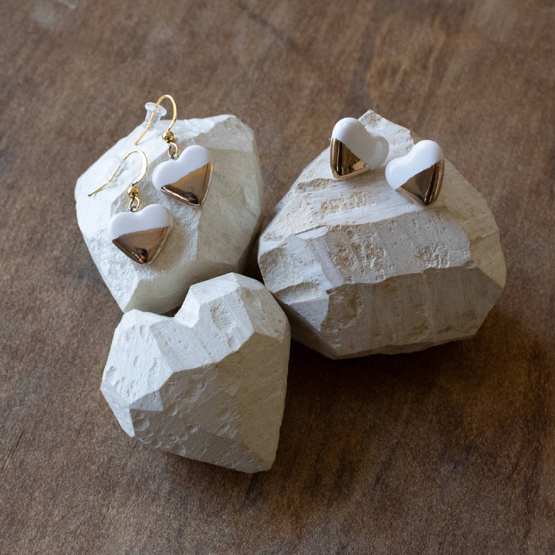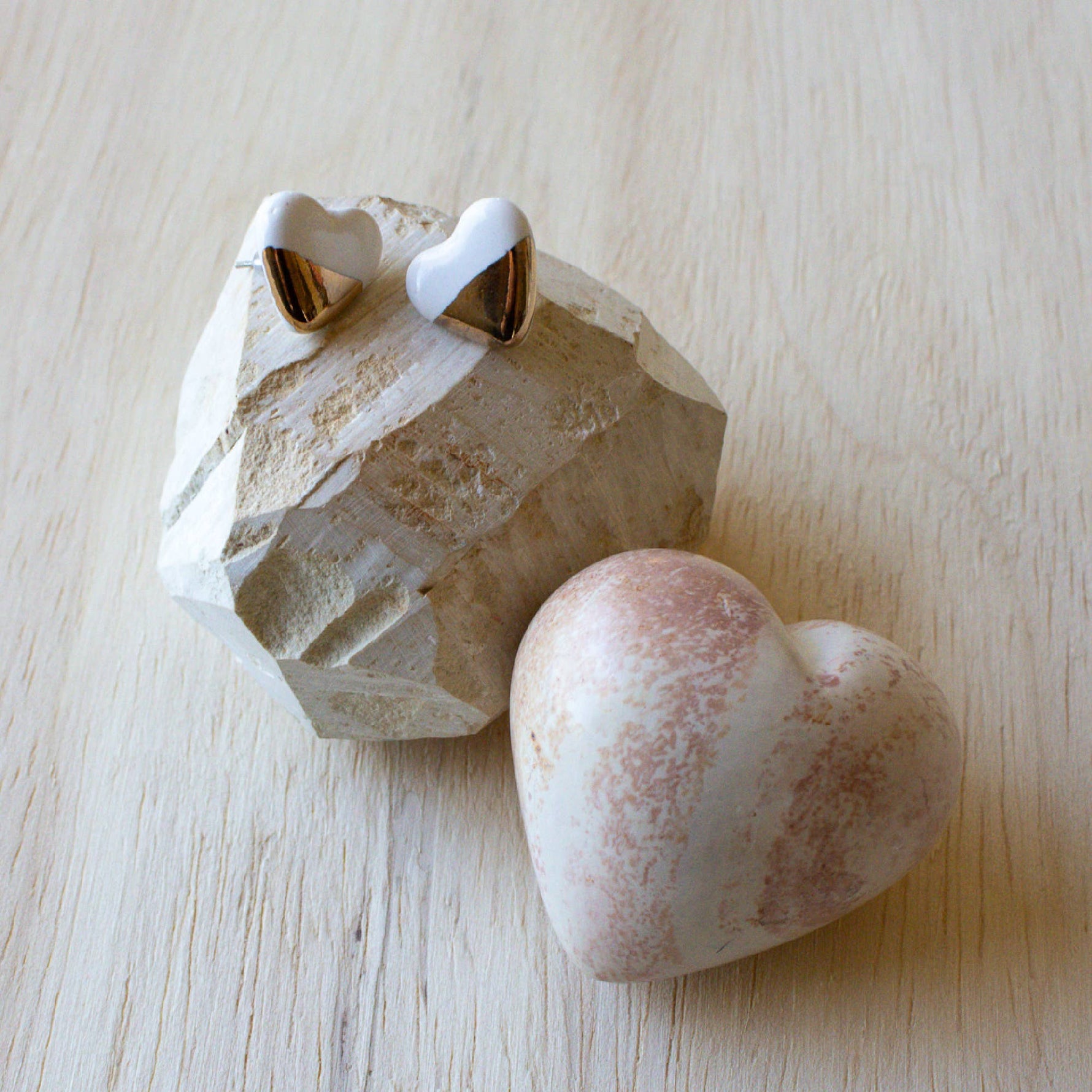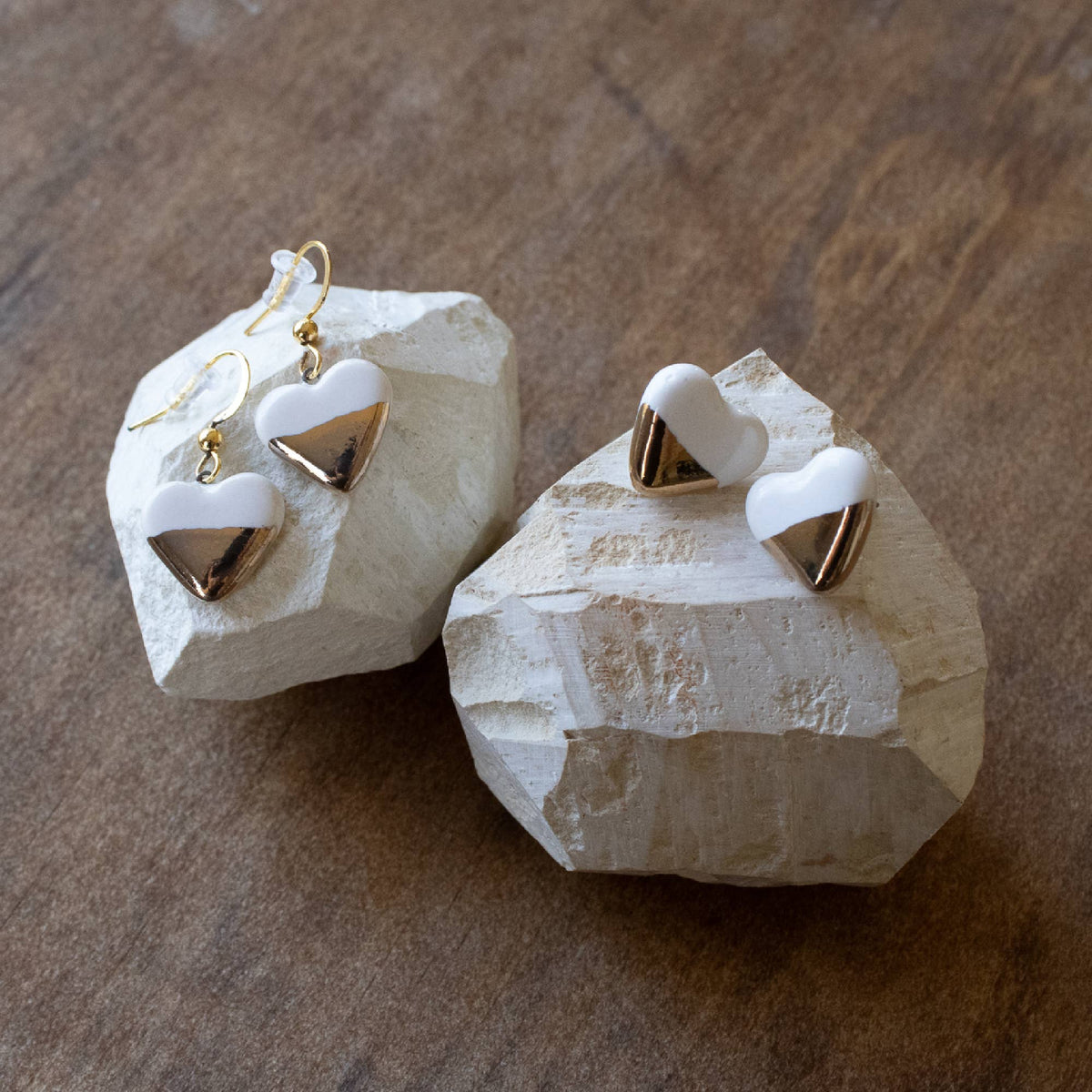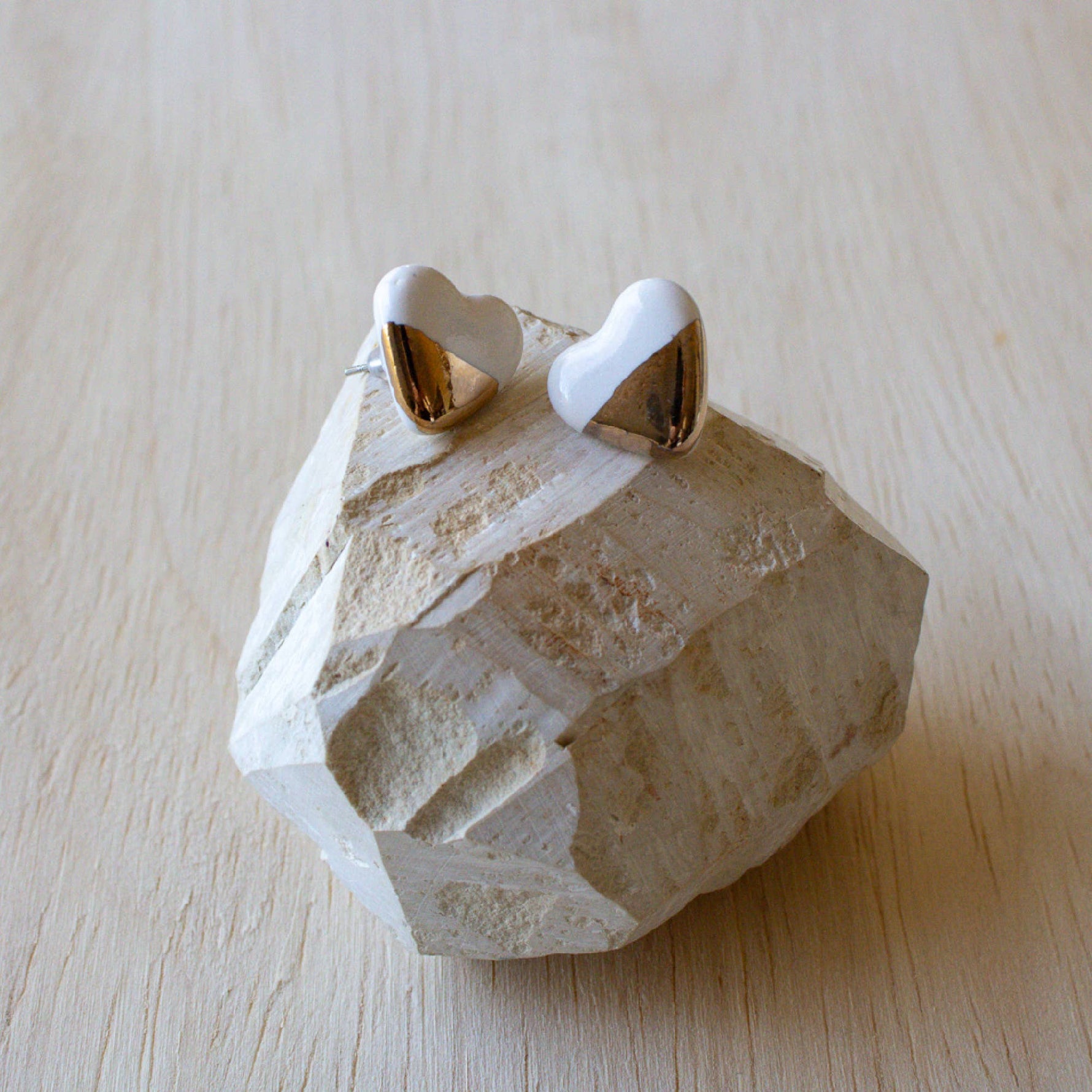 Ceramic Earrings | White and Gold Studs Small Hearts