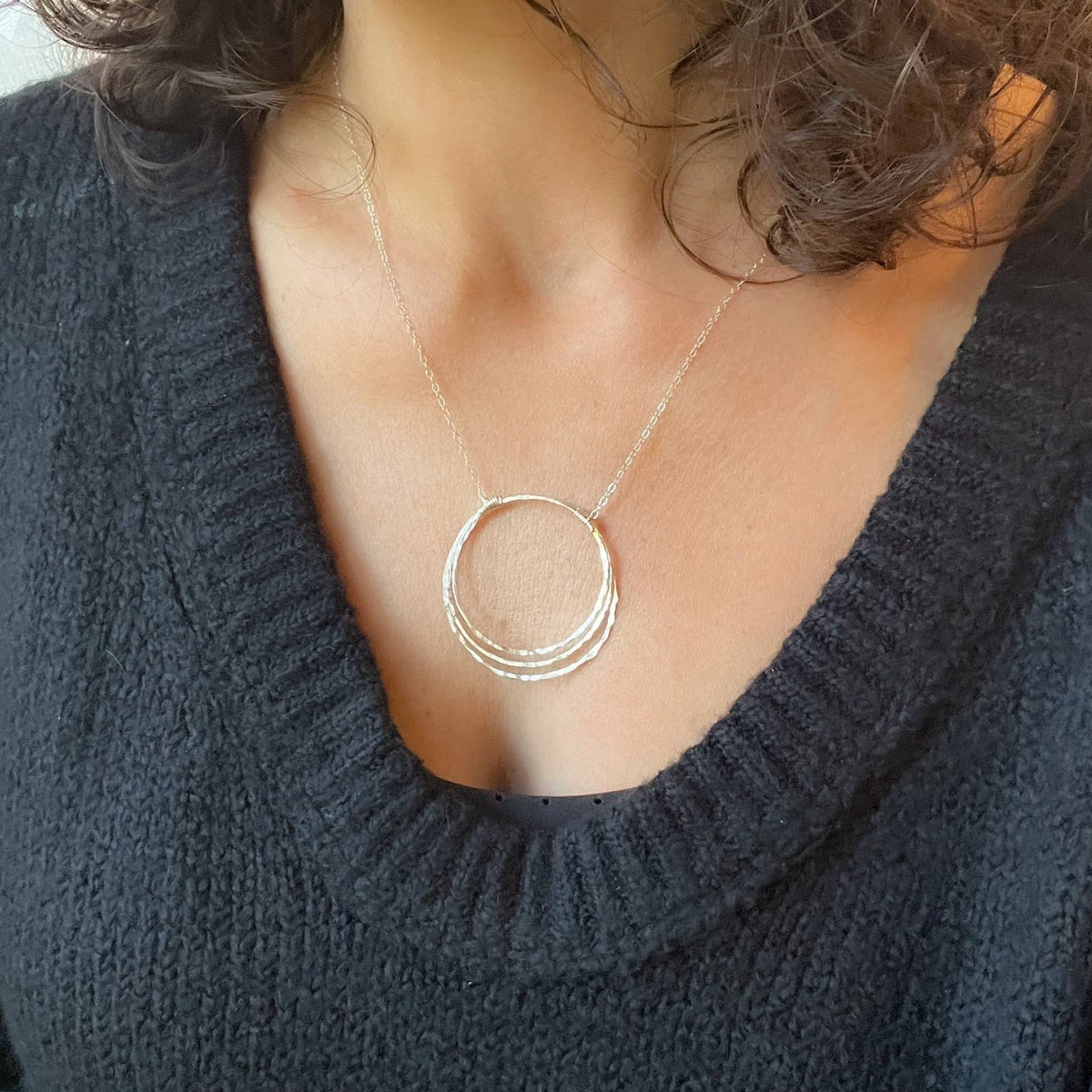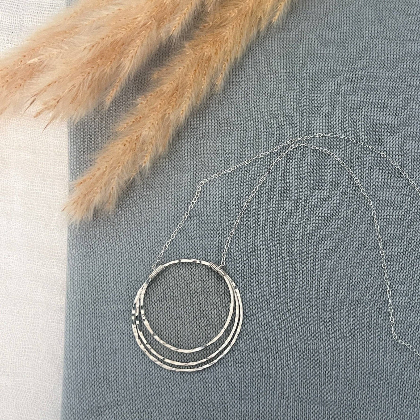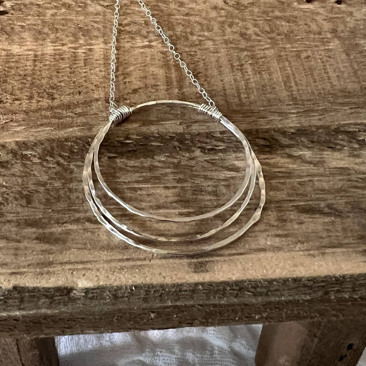 Silver karma necklace featuring three, rustic circles held together with a fine wire wrap. Each expanding circle is hand textured with hundreds of hammer blows; to harden the metal and add the unique character.