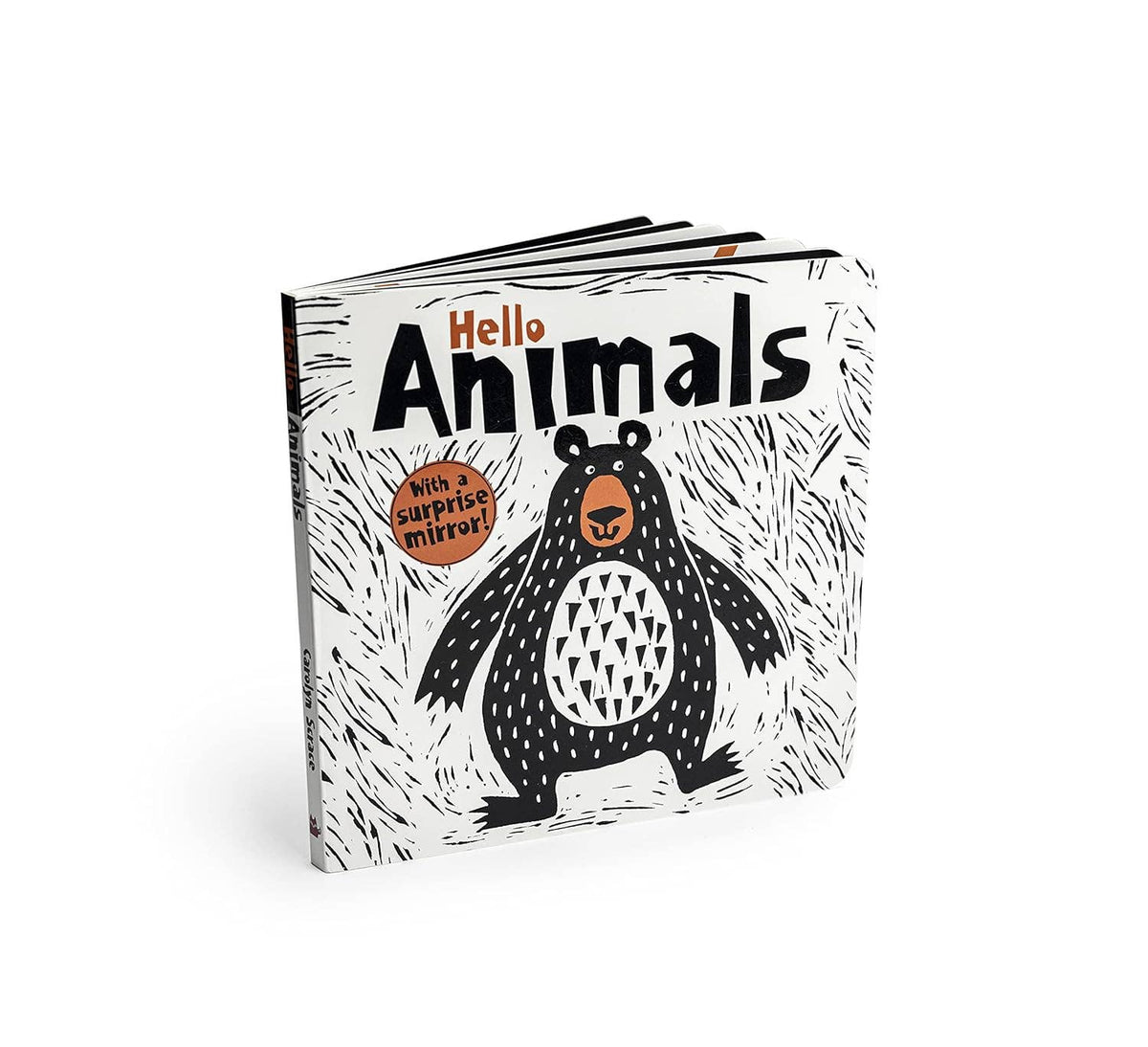 Say “Hello!” to the animals of the world with this beautiful board book designed specifically for babies! From monkeys and elephants to lions, sloths, and frogs, Hello, Animals is the perfect first baby book. A great early introduction to animals for your baby, every lino-cut artwork and high contrast design is intentional for a baby’s developing eyesight to make visual connections with simple shapes in simple black and white. Also included is a surprise mirror at the very end of the book to give your baby the opportunity to look at themselves – something babies just love to do! Easy wipe clean board book pages with rounded corners are perfect for children as young as six months. 12 Pages
