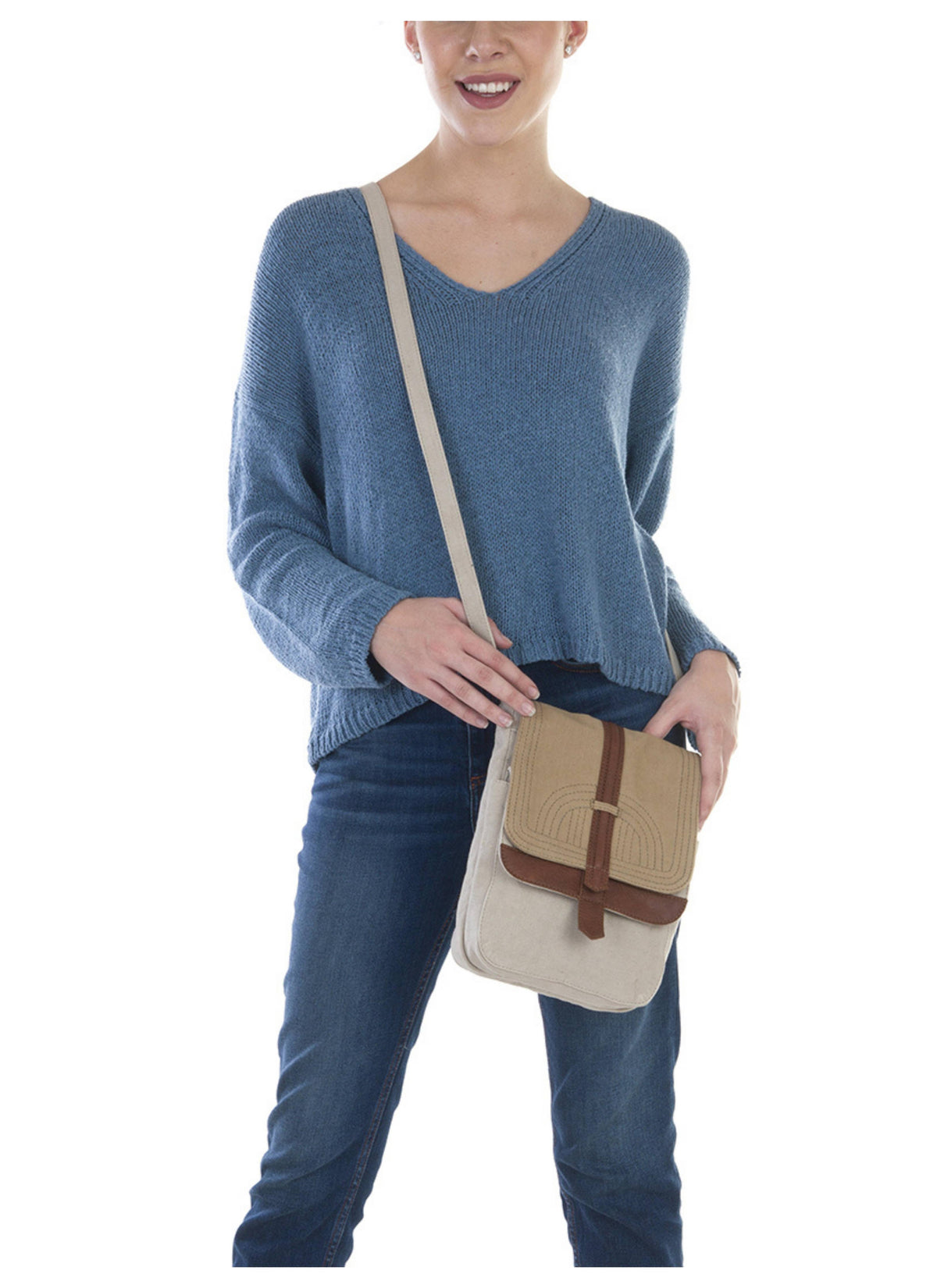Short Description: A minimalist bag with maximum impact, the laidback Oakley features dual compartments for optimal organization and convenience, this crossbody bag is perfect for busy days. Made from durable re-milled and up-cycled military tarps & tents used by the army, covering trucks as tarps and providing shelter as tents, this textile is given new life. This collection is part of a global initiative committed to up-cycling, re-milling, and zero-waste manufacturing.