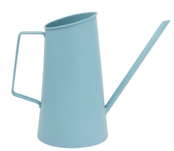 - 10" length, 4.75" width, 8.25" height, gardening, metal, watering can, modern design, sky blue, functional, stylish, minimalistic.