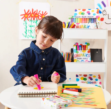 A starter set of Chunkies Paint Sticks in a travel-friendly pack of 6! These paint sticks are easy to hold and come in 6 classic and quick drying colors. You can twist up barrels for long-lasting, mess-free fun that kids and adults alike will love.