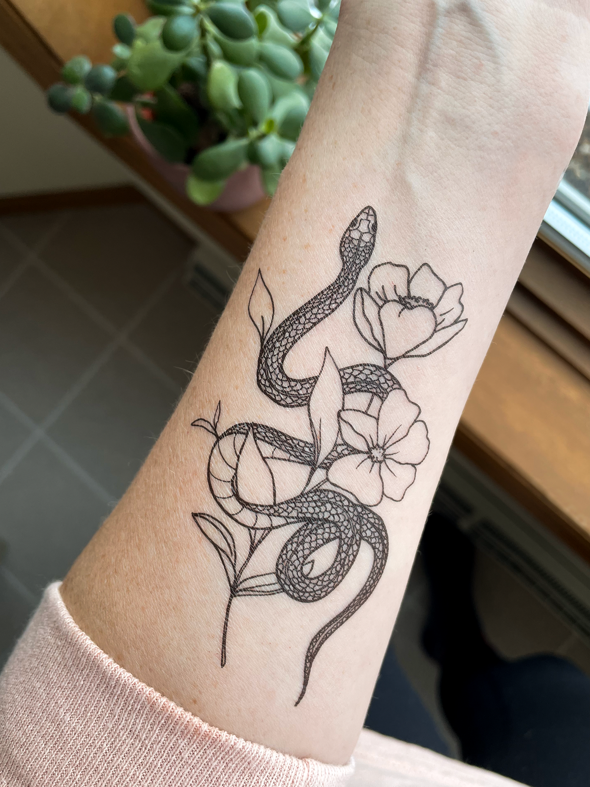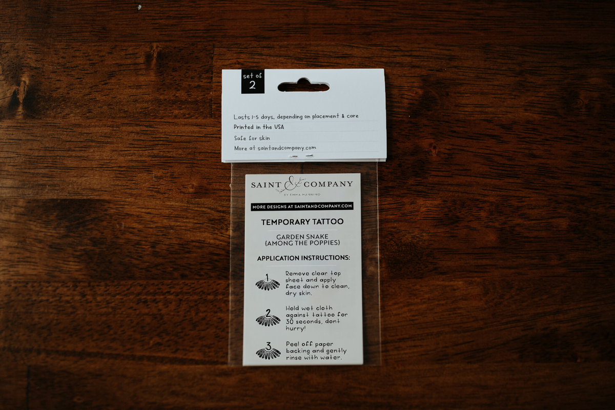 Featuring a hand-drawn garden (garter) snake slithering through poppy flowers. This temporary tattoo makes a thoughtful small gift or a pain-free way to try out a tattoo!