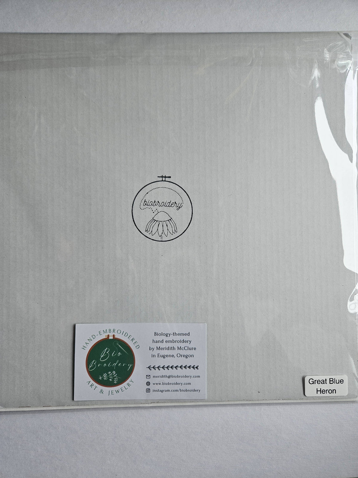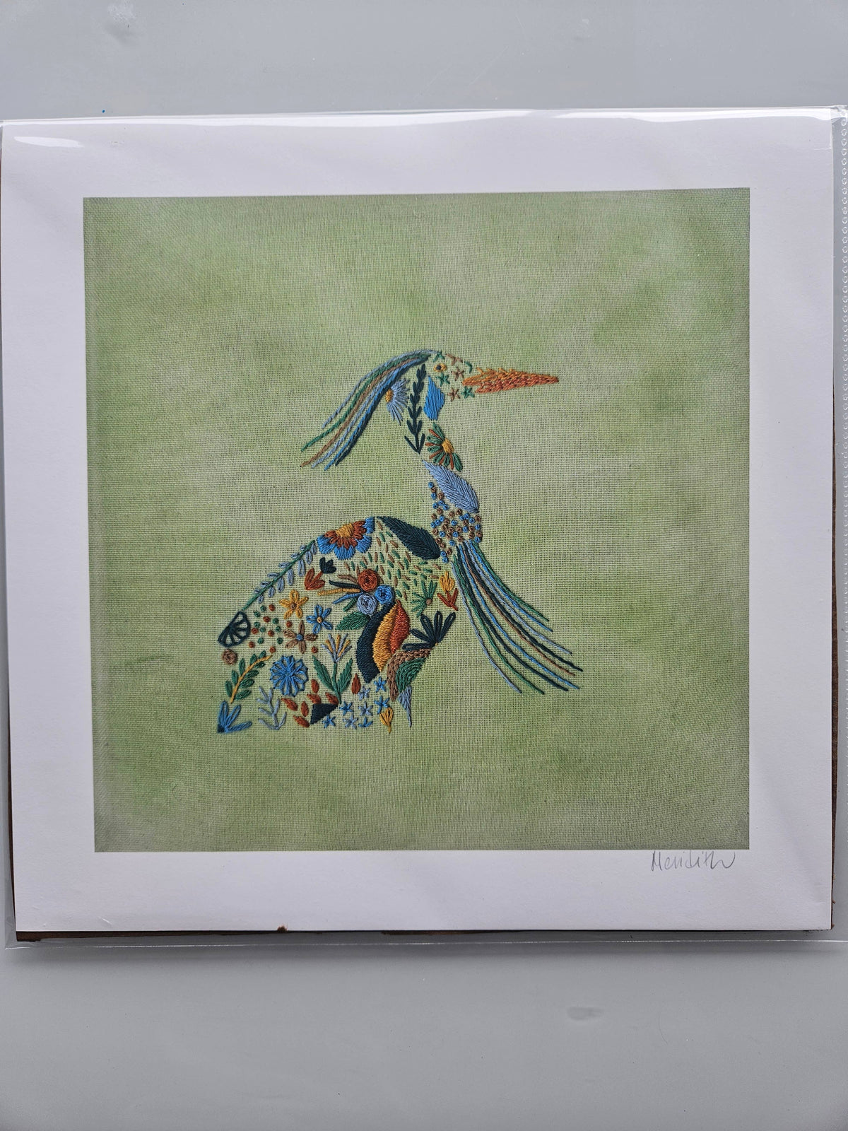 Print on archival fine art paper from hand-embroidered and water-colored original canvas art. Dimensions including the white border are 10x10". Each print is signed by the artist. Great Blue Heron (Ardea herodias). *Does not include frame in picture. Framed photo is a styled mockup of the print.