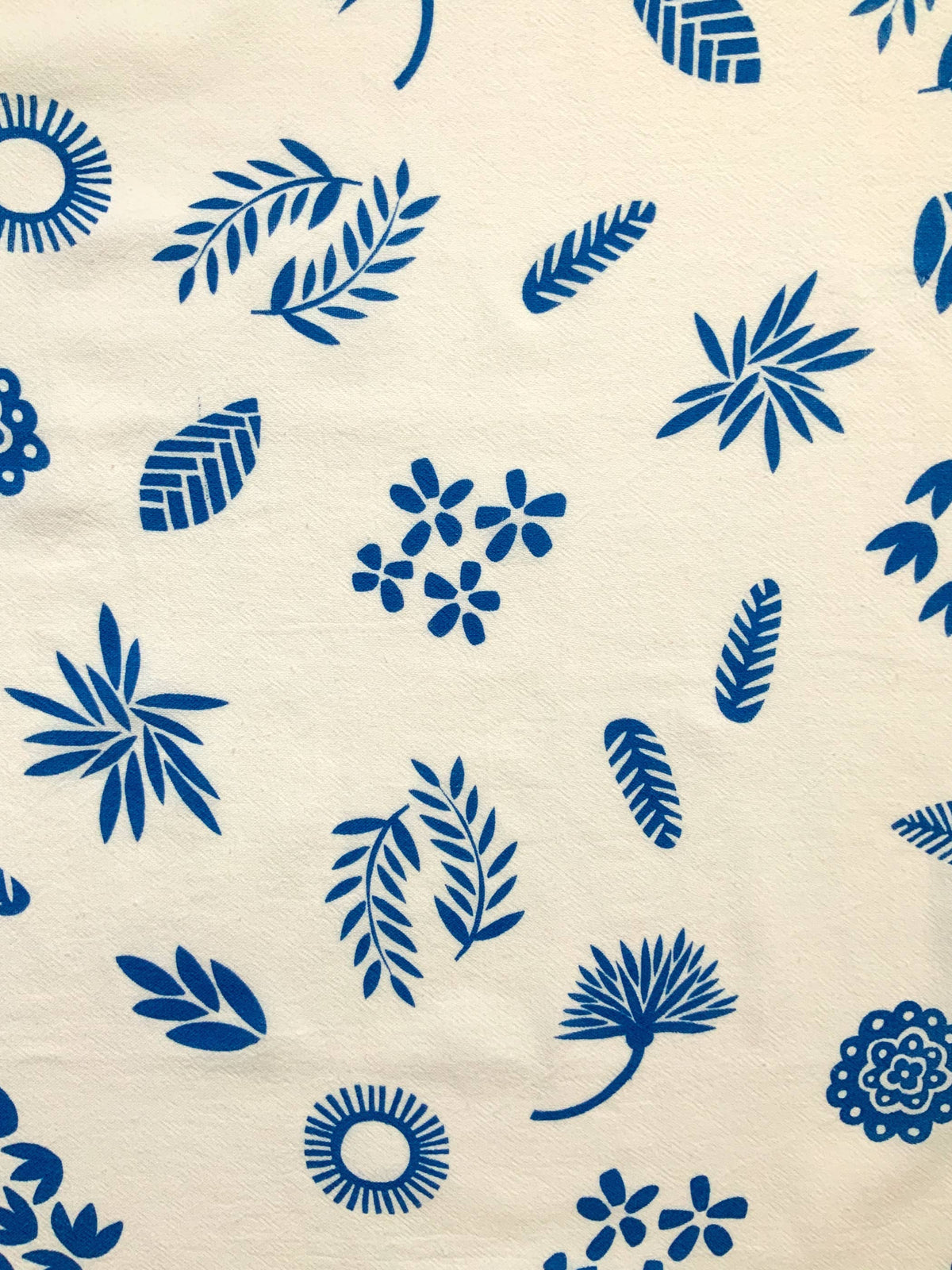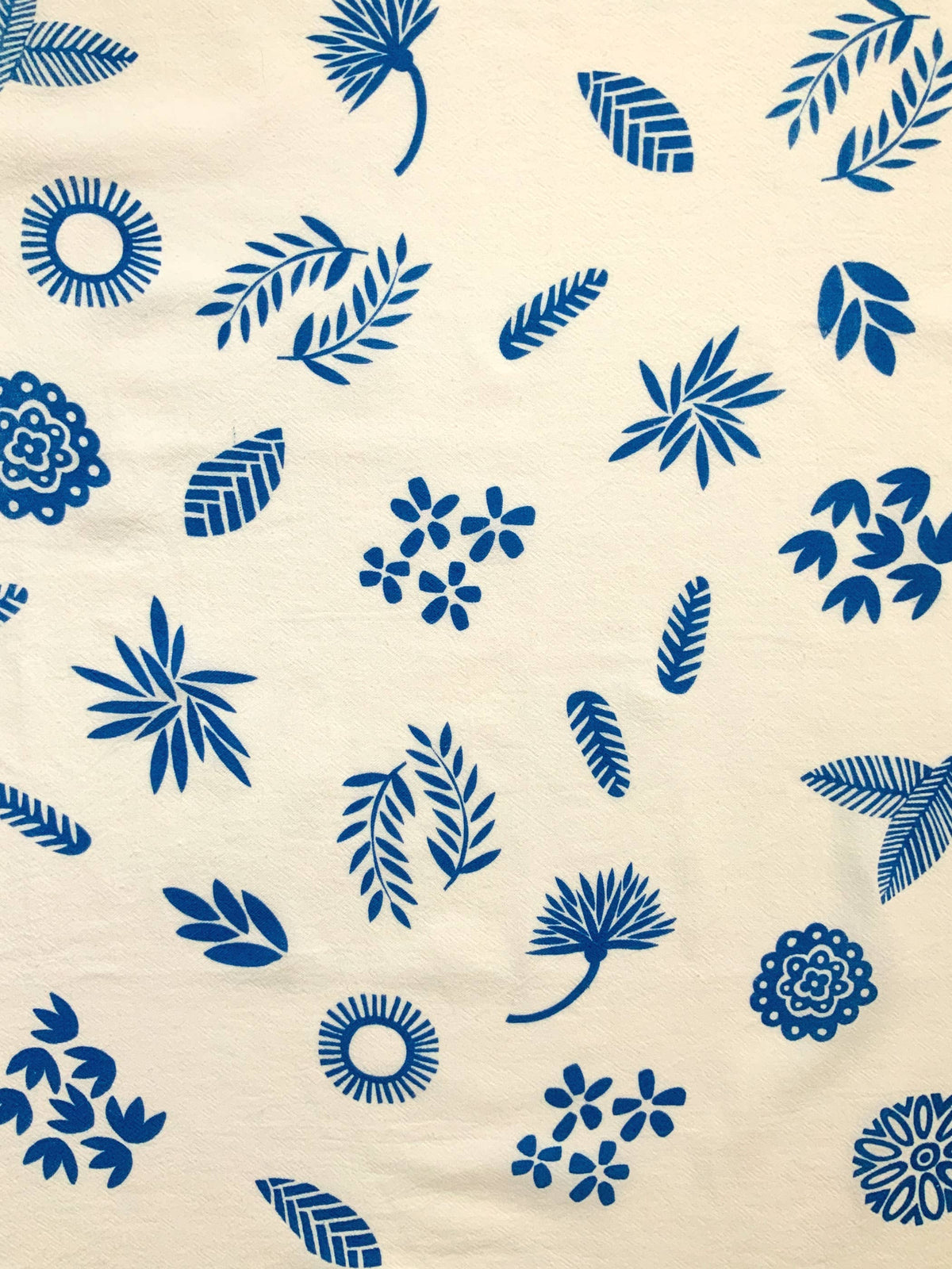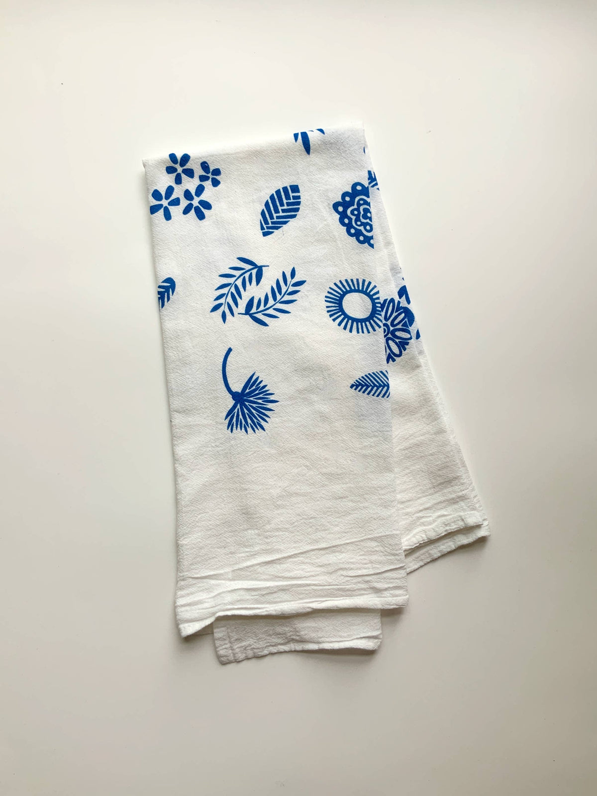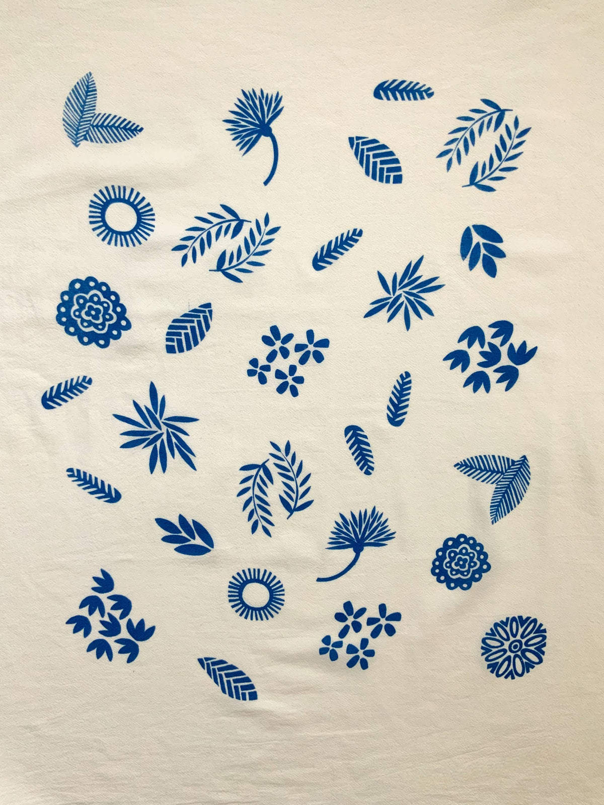 Unit price / perThis tea towel image is based on a hand carved stamp. Screen printed 100% cotton Tea towel. Garden images printed in a blue onto whiter flour sack towel. Heat set for machine washability. Towel made in India. Image size: 15" x 19" towel dimensions: 28" x 29""