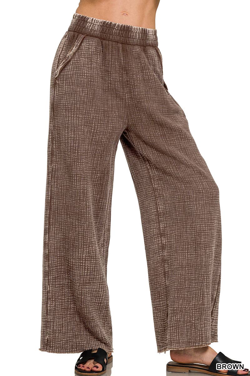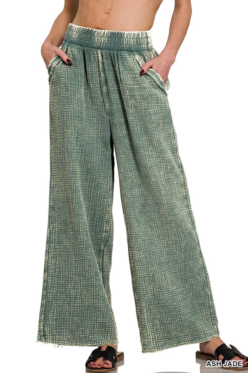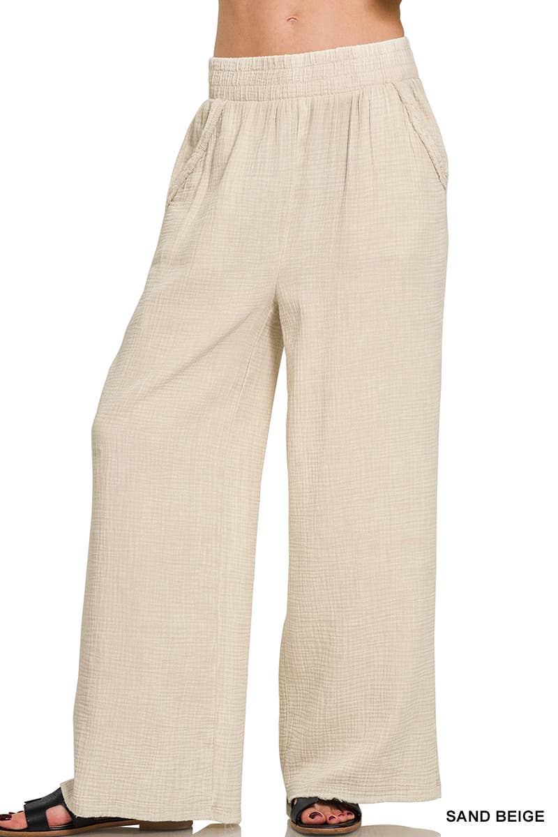 Unit price / perThese washed gauze pants feature charming raw edge details and a comfy elastic waistband. With handy side pockets, a relaxed 25.5" waist, and an inseam around 27" (excluding the frayed hem), they offer both style and ease. Made from 100% cotton, their leg openings measure approximately 24" for a breezy fit.