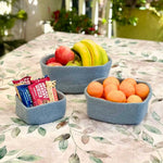 - Set of 3 nesting bowls: Large (8" x 3⅛"), Medium (6.25" x 3"), Small (4.75" x 2.75")