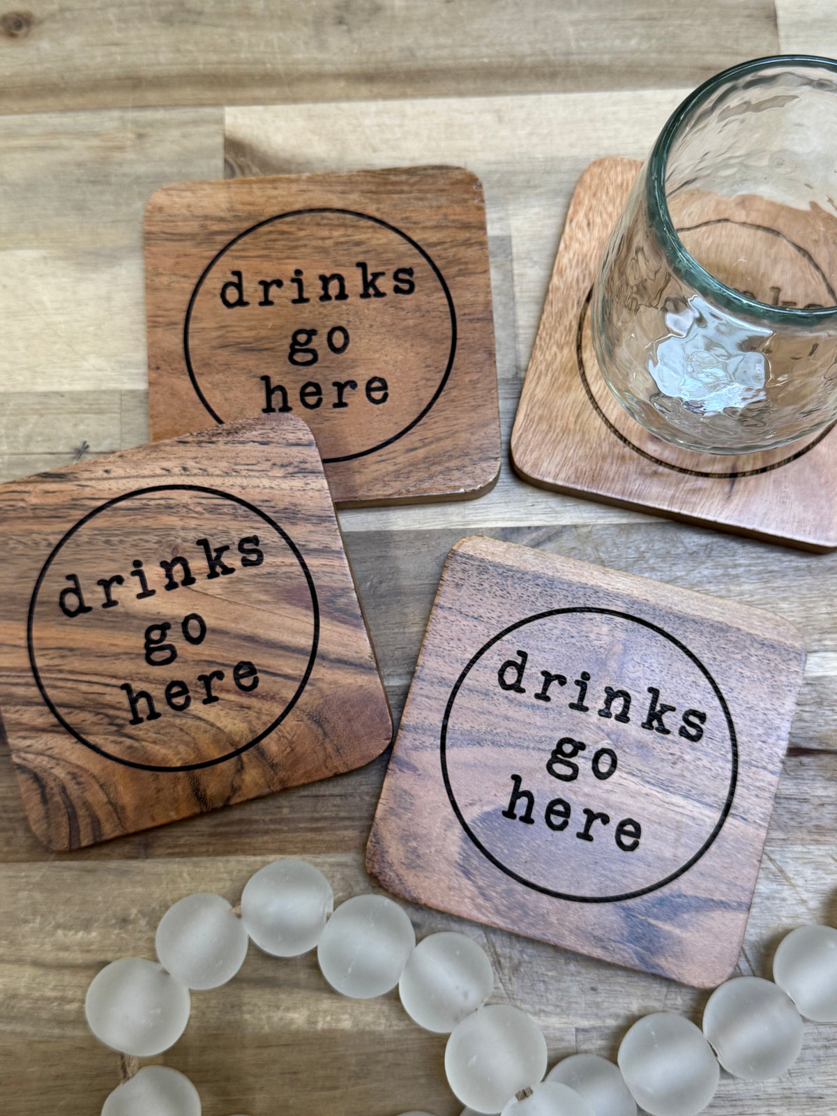 Unit price / perThis set of four acacia wood coasters are engraved with our round "drinks go here" design.