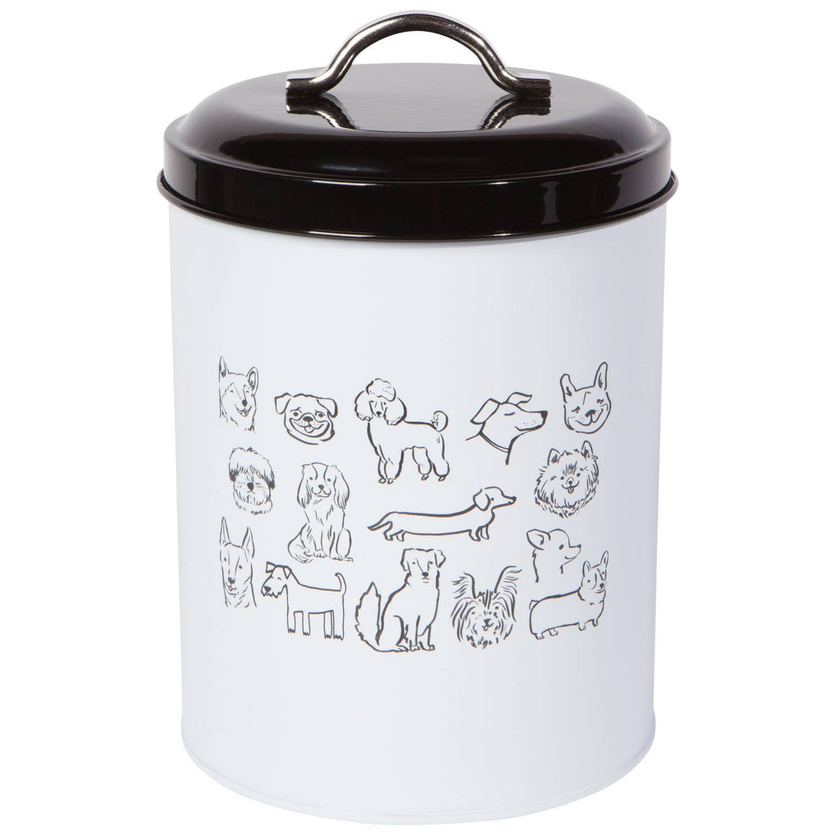 Out of sight, out of mind? These stylish lidded tins hold dog treats out of reach of canine friends. Paws-itively playful patterns show that your furry friend means more than just puppy love. This collection fetches lots of smiles and wagging tails! Dimensions: 5 x 7in Material: Powder-Coated Steel Care Instructions: Hand wash only.