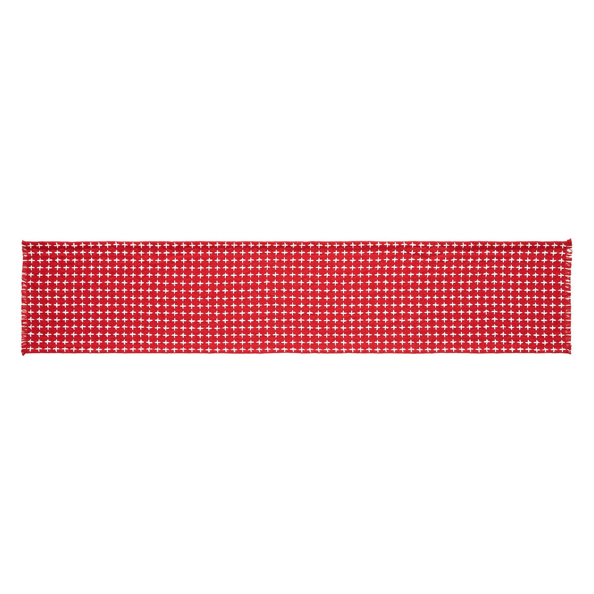 Add a simple, yet bold and charming accent to your Christmas table decor. The Gallen Red White Table Runner measures 12x60 inches. A blend of recycled cotton and polyester is woven in a deep red with a contrasting white stitching pattern for a look that leans into traditional Christmas colors without being overwhelming. Soft fringed edges add a comforting country feel to the design. Coordinates with the Gallen Red White Collection by VHC for a complete timeless winter look.