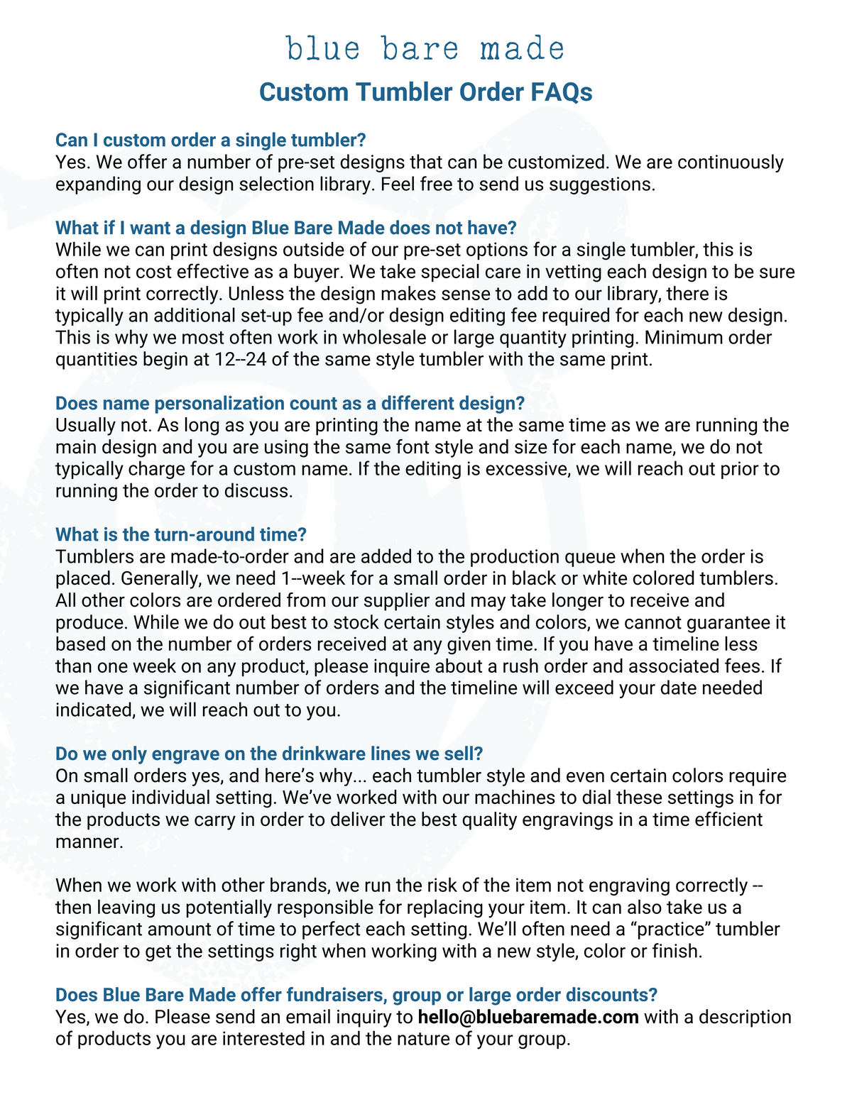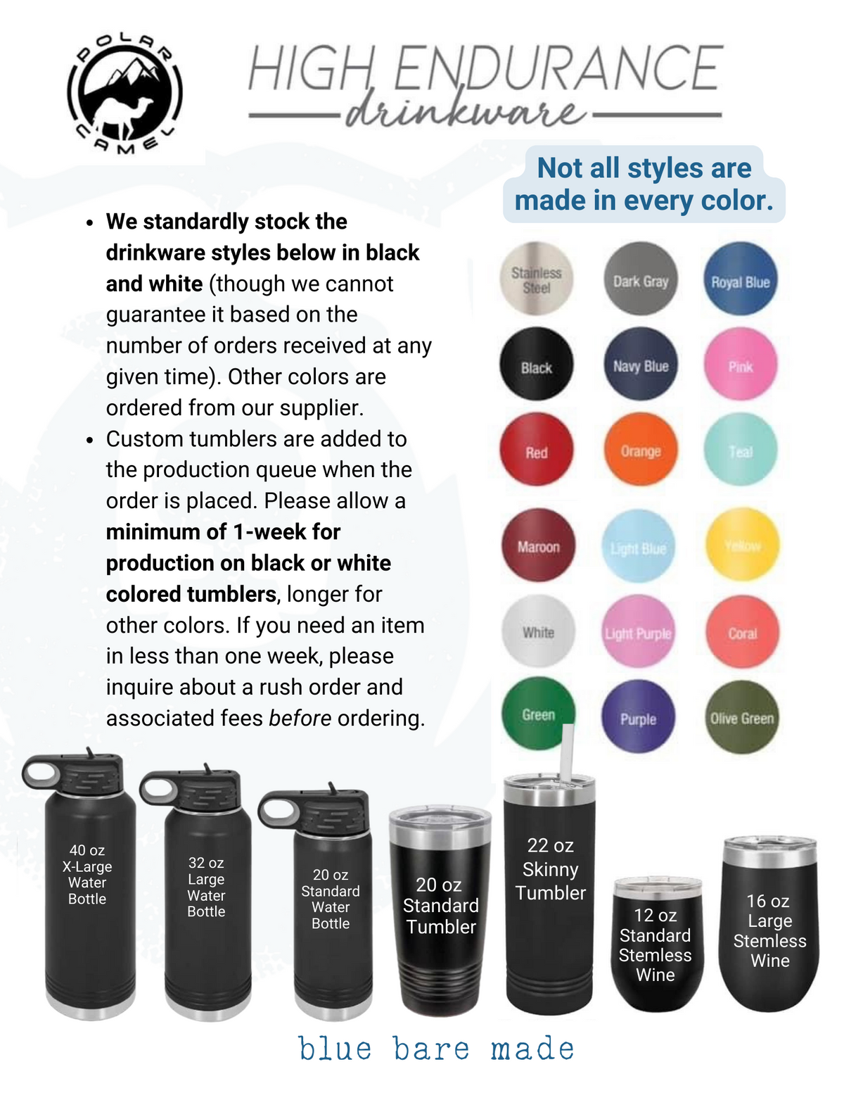 Polar Camel Brand quality tumblers keep a beverage warm or cool, are stainless-steel double-wall vacuum insulated, color powder coated (except plain stainless), and BPA free. All completed engravings will be displayed in the stainless steel silver color. Items include a flip top straw lid, straw, sip lid or slider lid as listed. Final cups will have a tiny 0.5” Blue Bare Made logo imprint opposite your design on the back and towards the bottom of the cup.