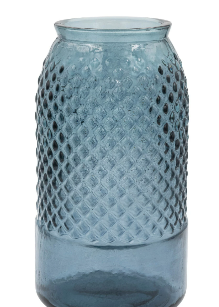 This embossed reclaimed glass jar is a beautiful and functional piece that will enhance the home with its blue color and round shape. The jar is made of reclaimed glass, recycled from old bottles, jars, or windows. Reclaimed glass is eco-friendly and unique, as each piece has imperfections and variations. The jar has a lid that seals the jar and keeps the contents fresh and clean. The jar also has embossed details that add texture and charm to the piece. Use this to store and display dry food items such as candy, cookies, nuts, or spices. It has a simple and elegant design that can fit any French country, farmhouse, vintage, cottagecore, or coastal style decor. The jar can be placed on a counter, a shelf, a table, or a windowsill, adding a touch of color and charm to the home. It measures 6 inches in diameter and 11 inches in height. This food storage will elevate the home decor, whether for everyday use or special occasions.