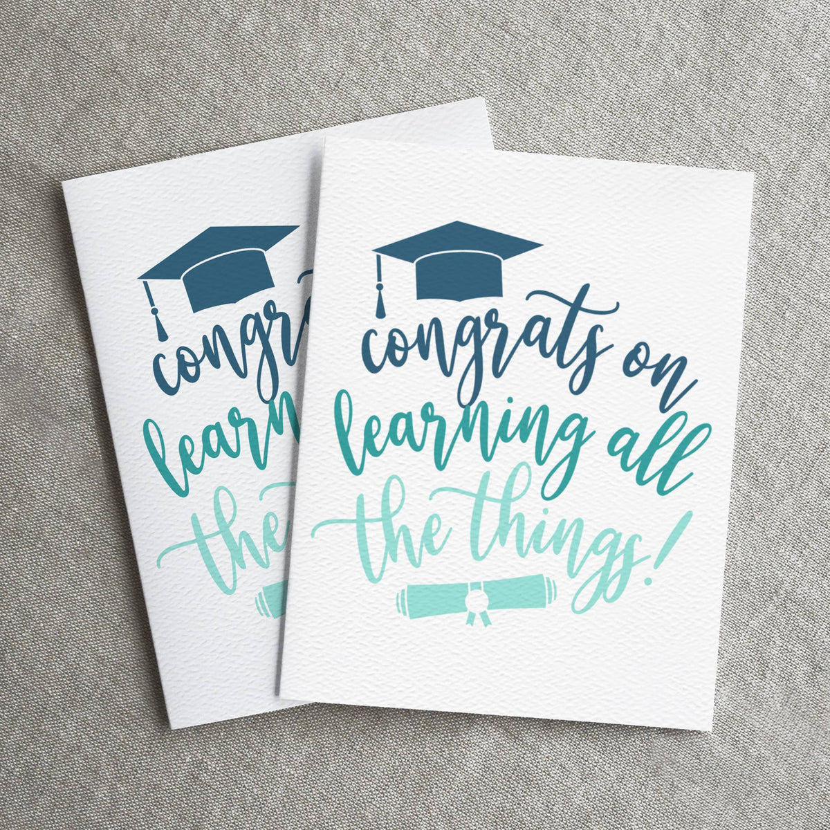 This graduation card makes an excellent way to say congratulations to new grads. Card says: Congrats on learning all the things!