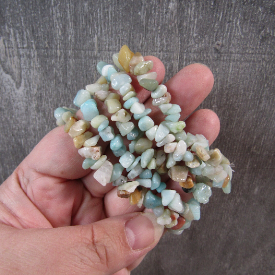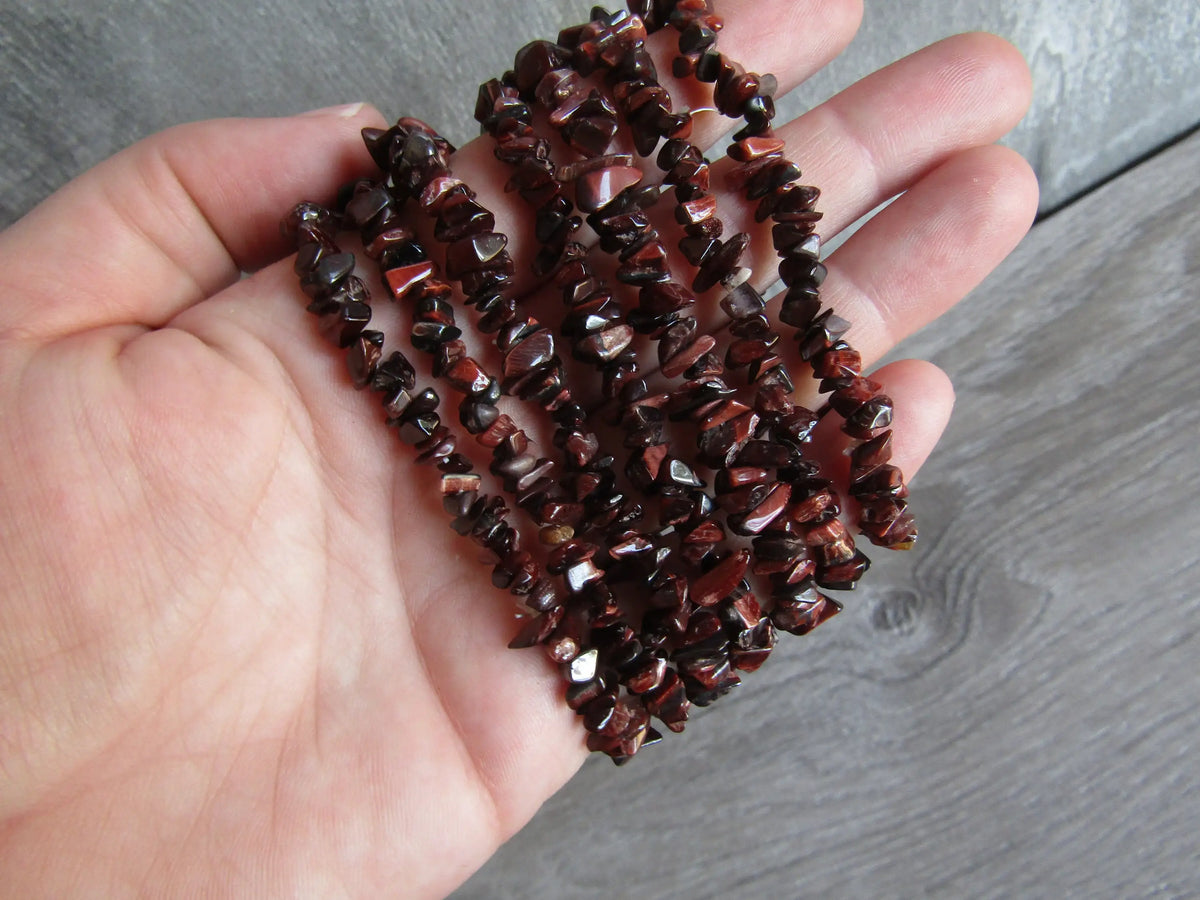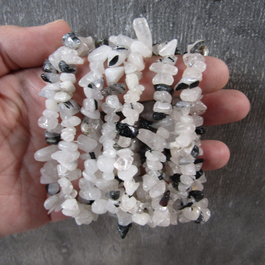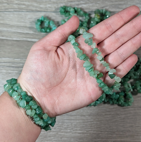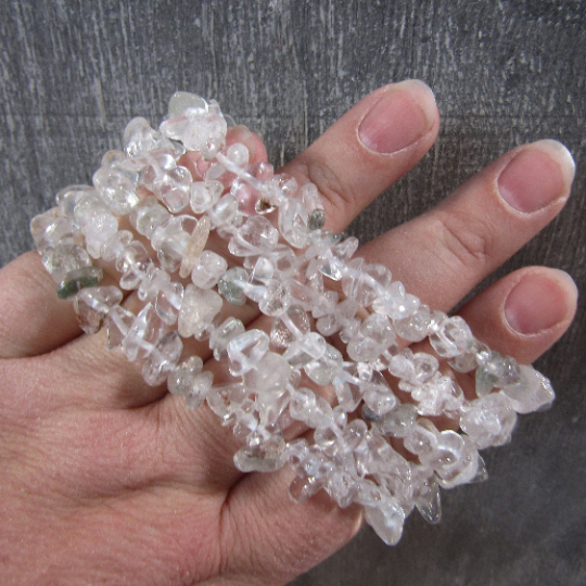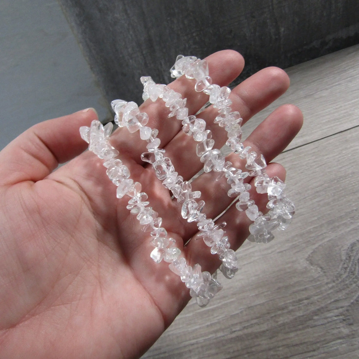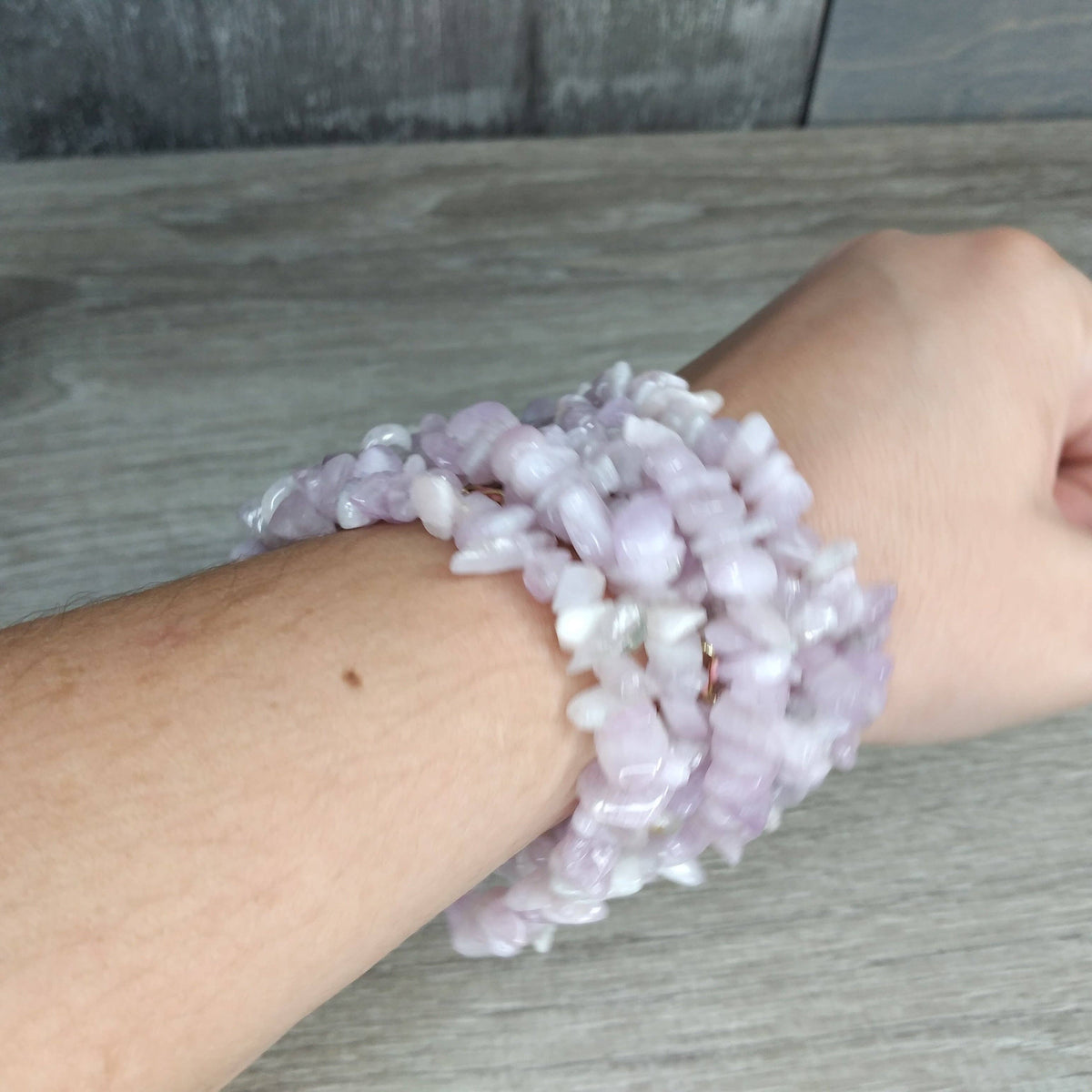Unit price / perGemstone chip bracelets featuring a variety of popular common stones like amethyst, rose quartz, clear quartz, sodalite, and aventurine. Each bracelet is crafted with polished crystal chips on a stretch cord.