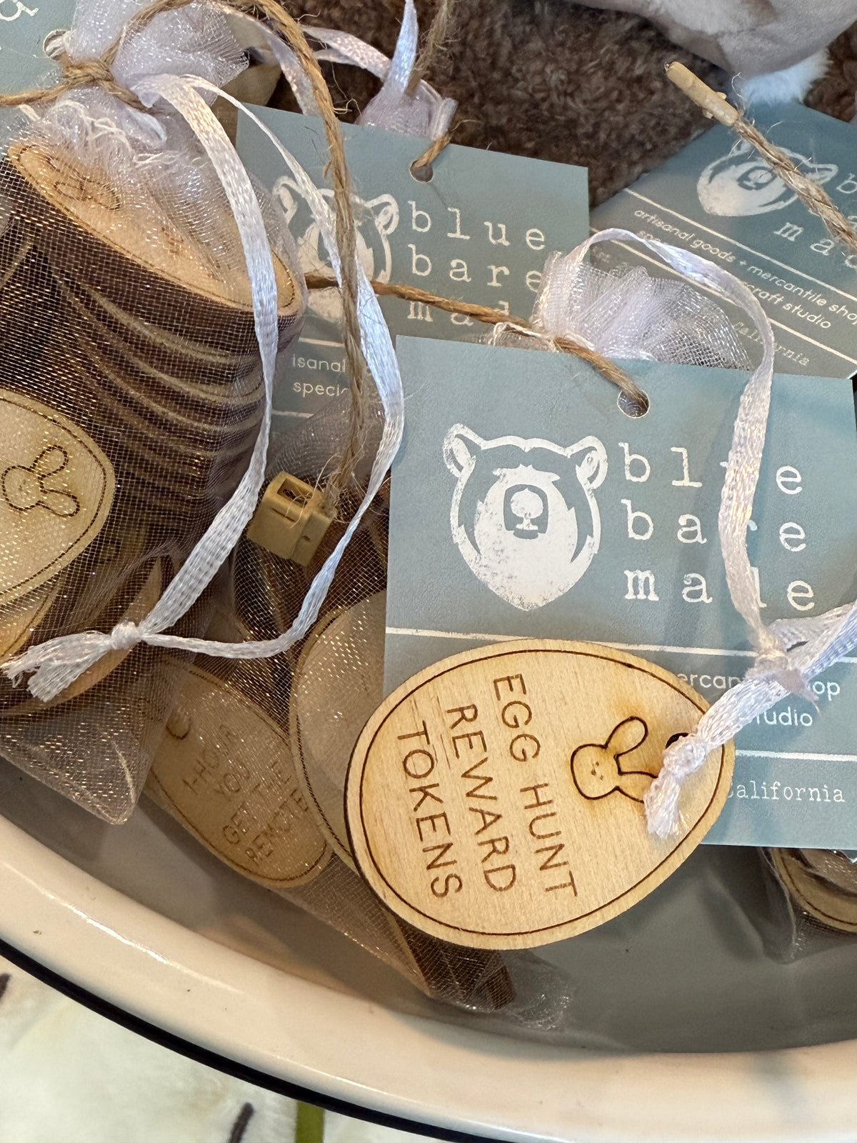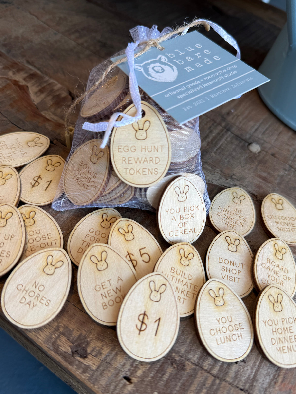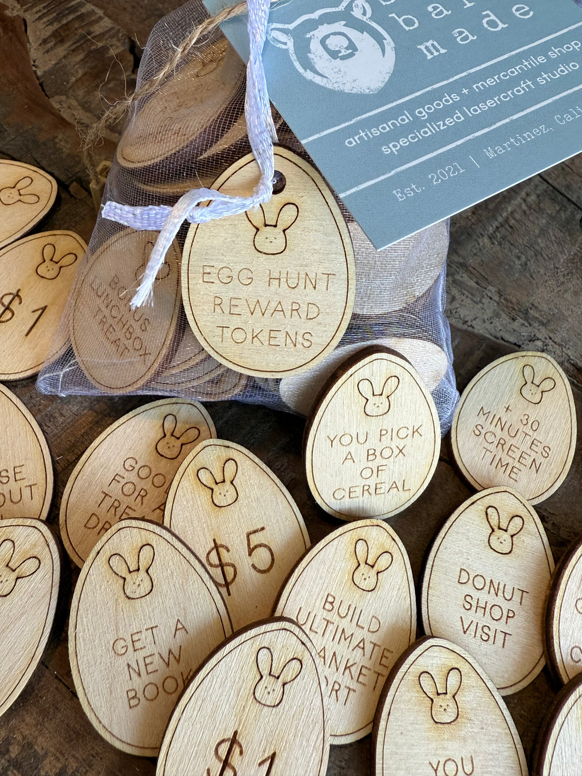 Unit price / perForget the candy! This set of 30 wooden reward egg-shaped tokens are the perfect reusable egg stuffer. Made in-shop at Blue Bare Merc. & Made.