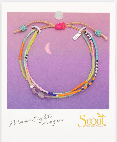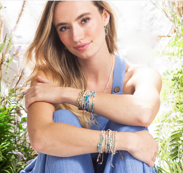 The semi-precious stone and its meaning are highlighted on the back on each card and connect to the photograph on the front of the card. Each playful stacking bracelet incorporates semi-precious stones along with Japanese glass Miyuki beads.