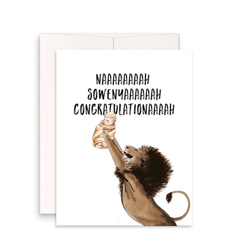 A funny reversed lion king theme new baby card. Perfect for the baby's first birthday party, baby shower gifts, and newborn baby congratulations card for new parents.