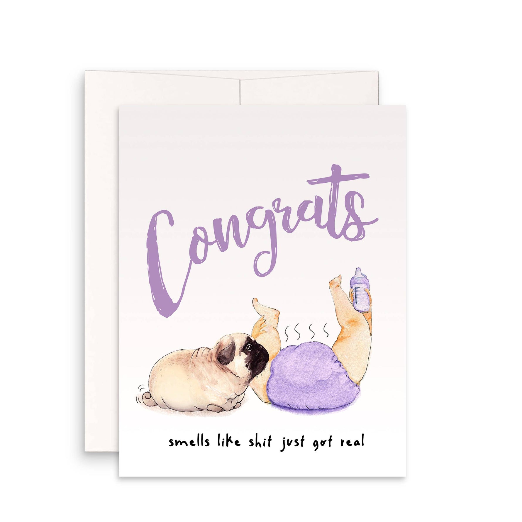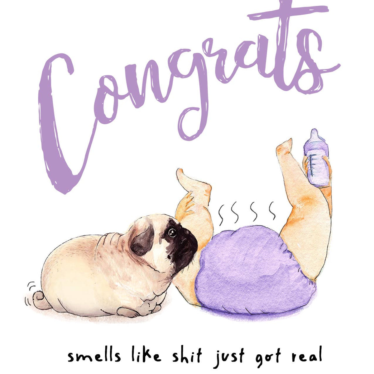 "Congratulations! smells like shit just got real" A pug sniff new born baby and announce a hilarious new baby congrats. This funny baby card would be a blast and bring waves of Laughters in baby shower party for the new parents.