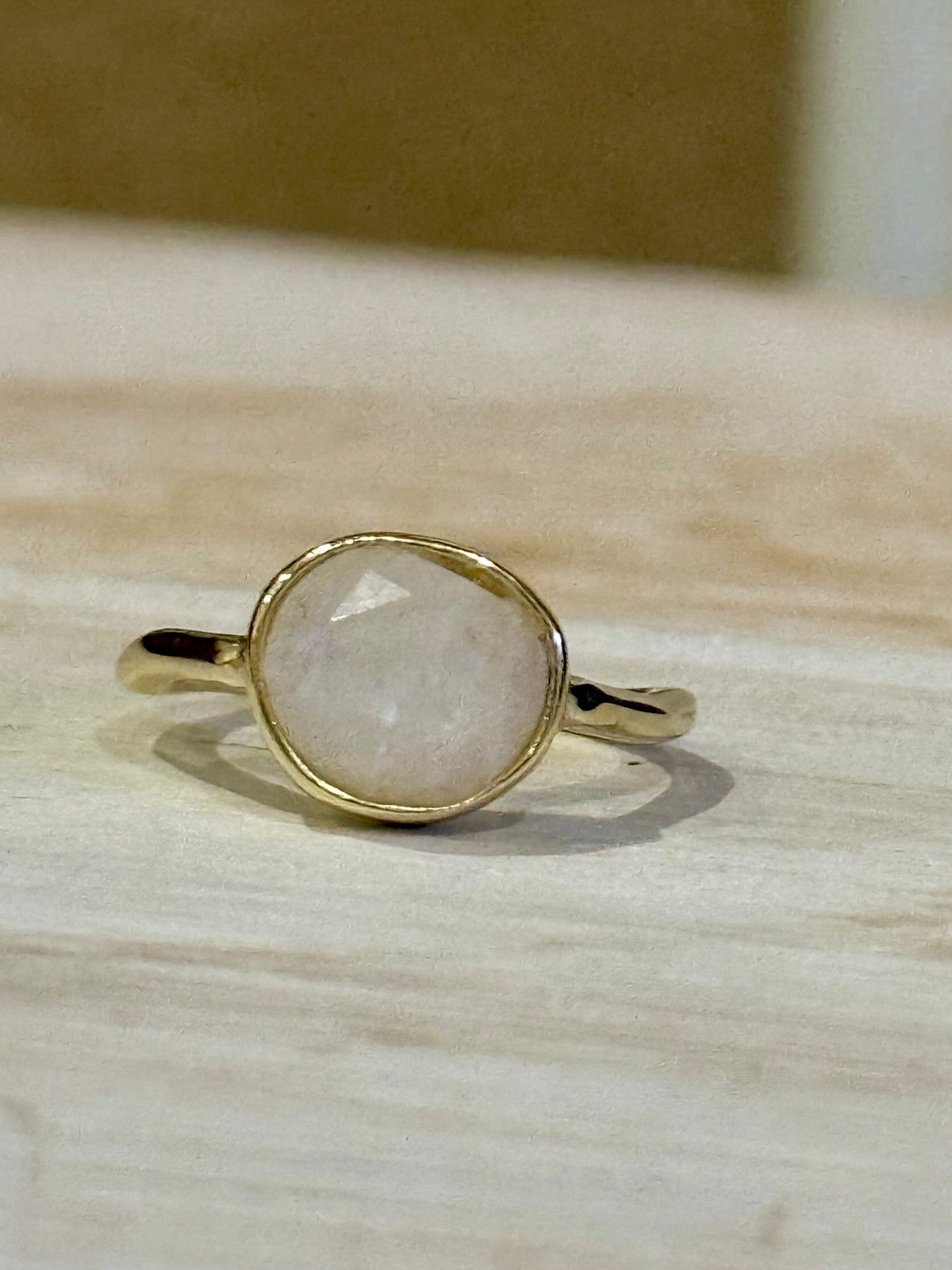 Unit price / perAdjustable stainless steel ring with oval white quartz. Highly tarnish resistant. Great for big kids, teens and adults.