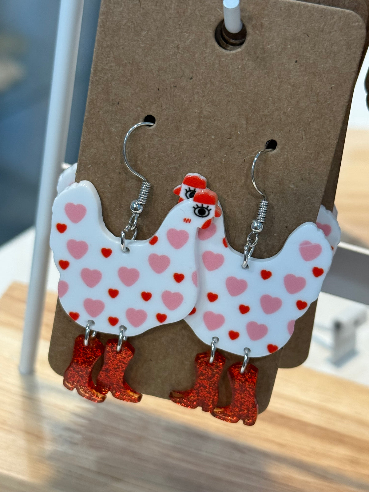 Acrylic Chicken with Boots Valentine Dangles. Great for big kids, teens and adults.