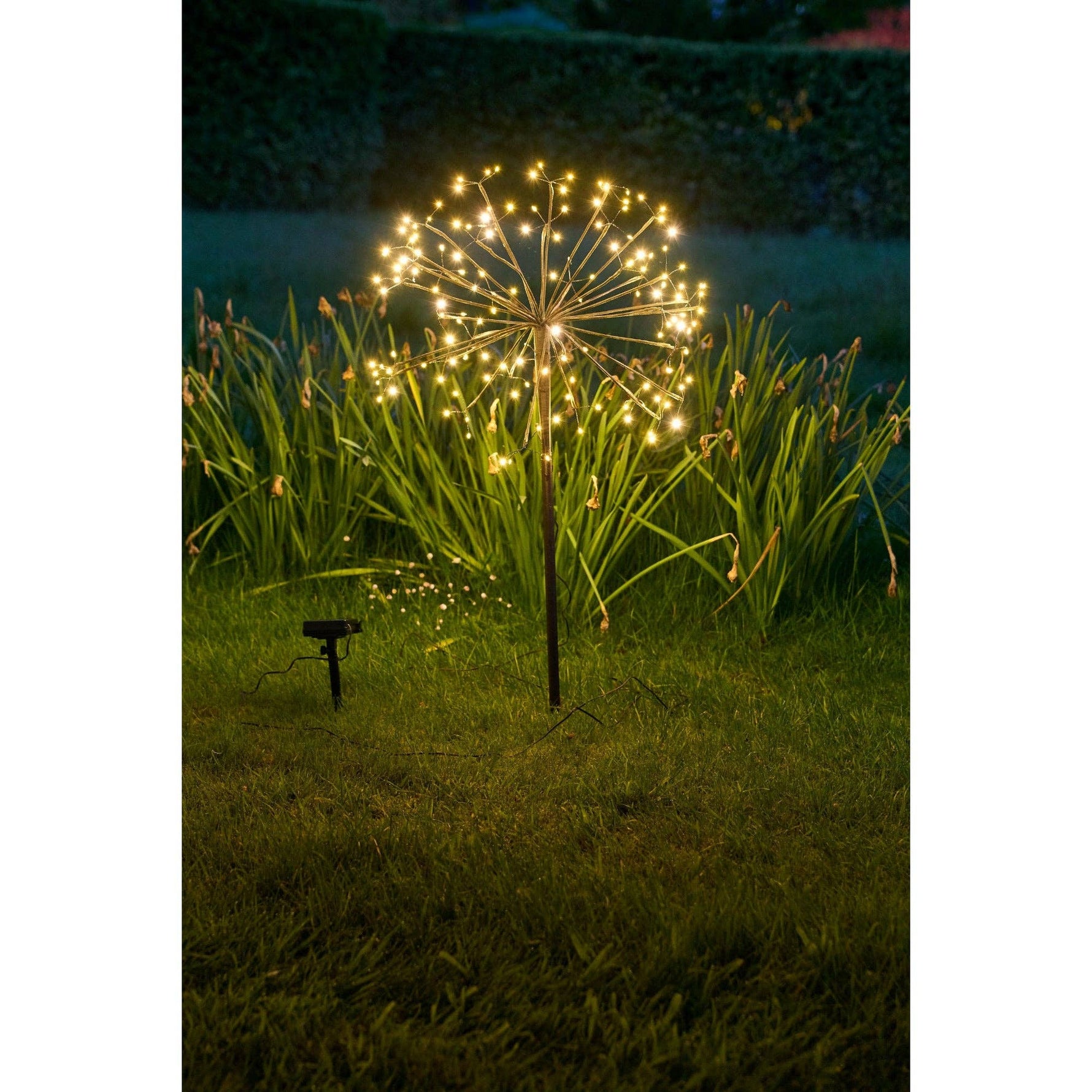 The larger size has 120 warm white LEDs with an illuminated diameter of 45cm with the smaller size having 96 warm white LEDs and an illuminated diameter of 35cm. Both have a total height of 100cm and a 3 metre lead to solar panel which can be positioned to best catch the sunlight. The light is Solar powered containing a built-in rechargeable battery. The solar panel dimensions are 9cm x 8.5cm x 2cm. The item is made from metal with the primary colour being dark brown.