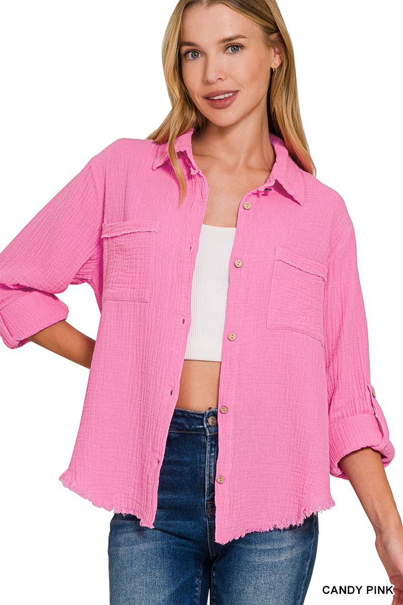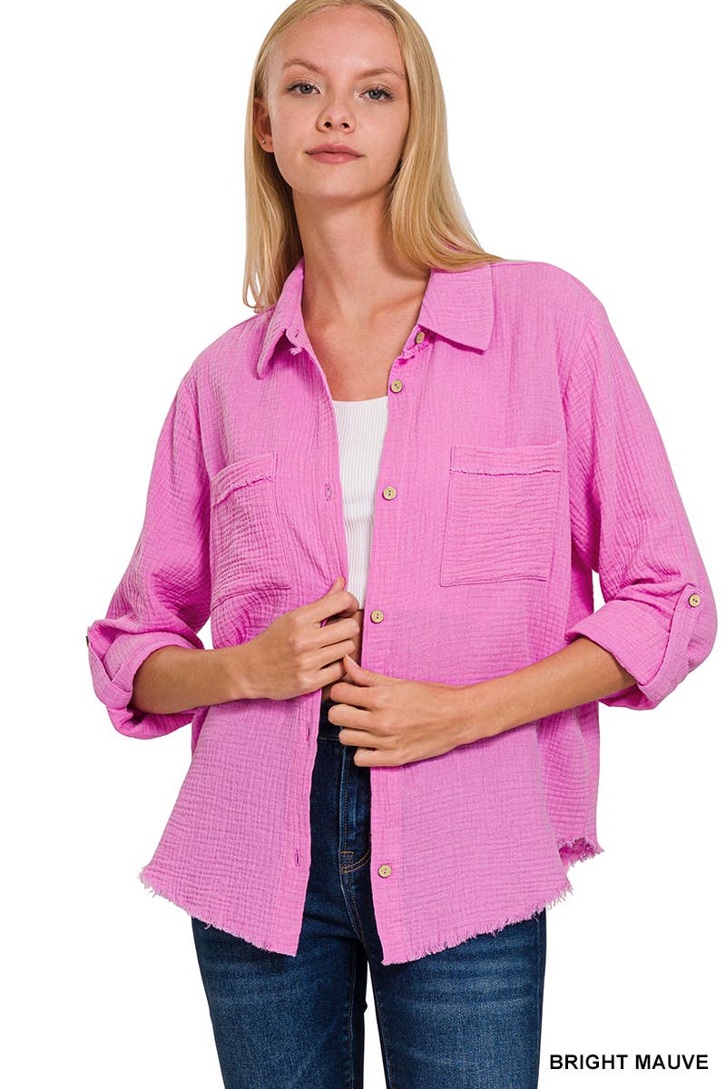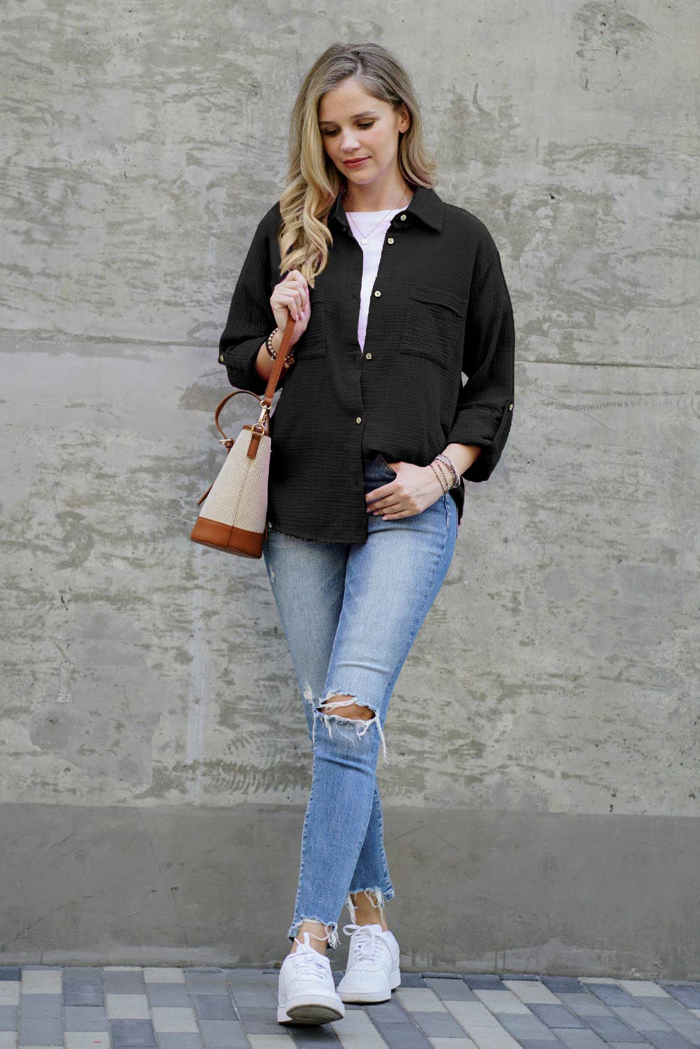 Long-Sleeved Gauze Top | Double Gauze Button Down Roll Up Long Sleeve Shirt