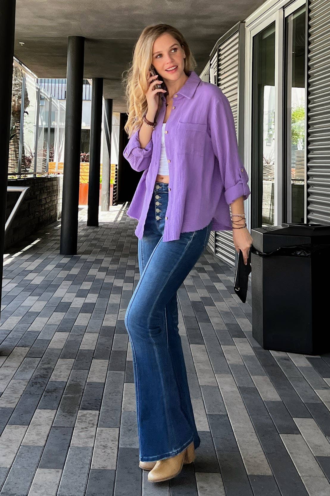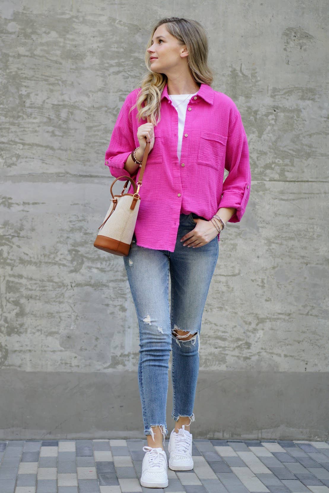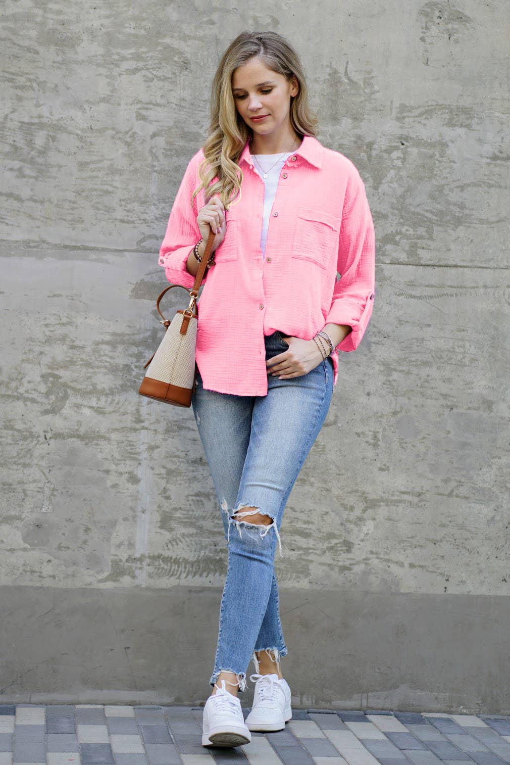 Long-Sleeved Gauze Top | Double Gauze Button Down Roll Up Long Sleeve Shirt