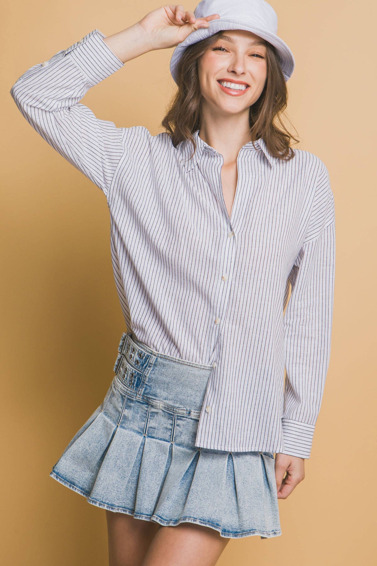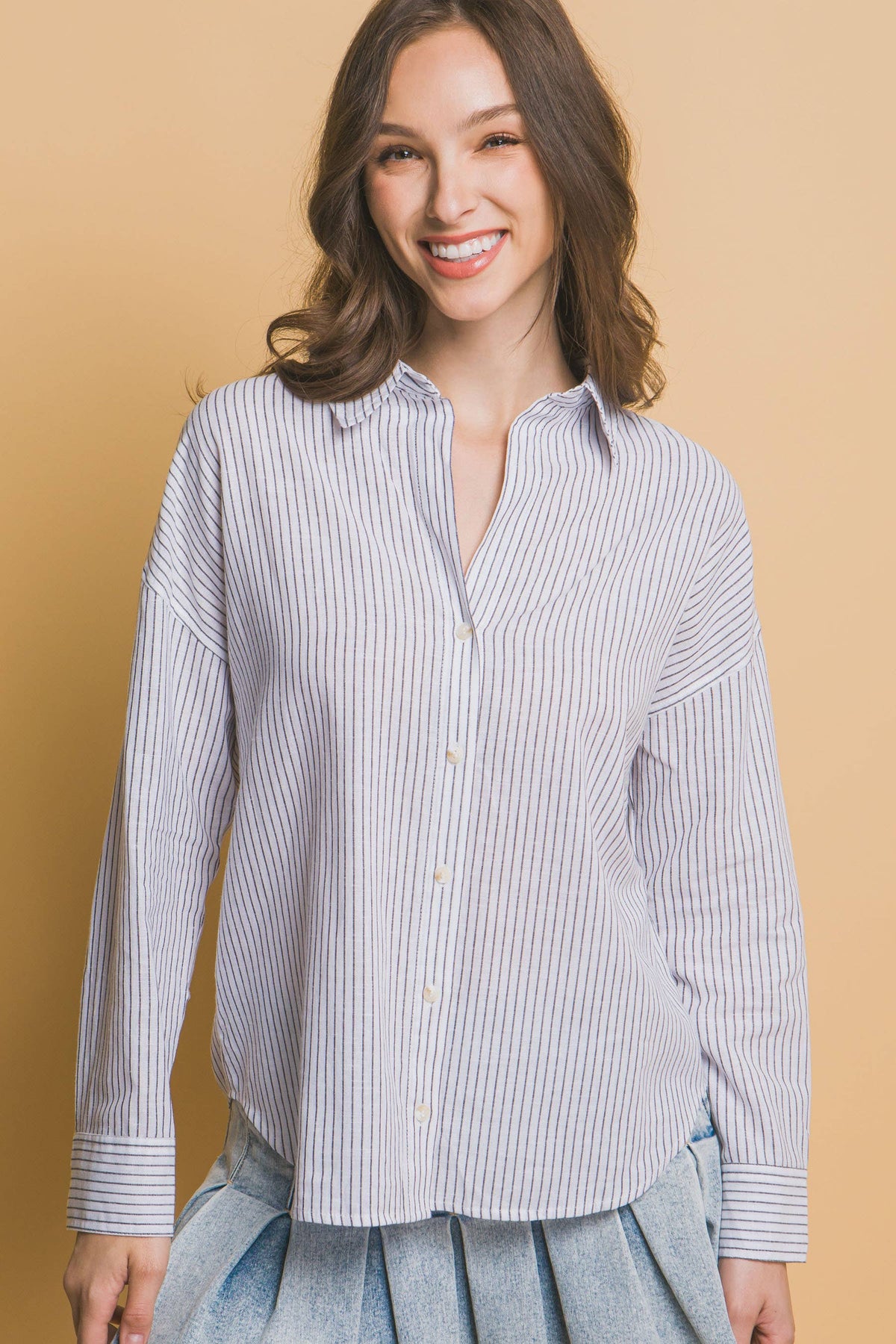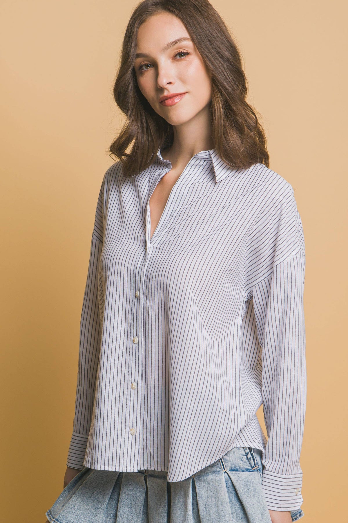 Long-Sleeved Linen Top | Buttoned Stripe Linen Shirt