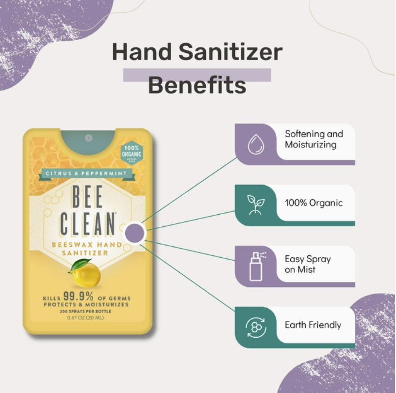 Unit price / perBee Clean Beeswax Hand Sanitizers help you stay healthy and humming by killing germs with kinder, 100% organic and natural ingredients. Our spray-on mist is mess free via our convenient, innovative, recyclable packaging. Bee Clean contains natural antimicrobial peptides and organic ethyl alcohol to kill 99.9% of germs. It moisturizes using beeswax, vitamin E, avocado oil and apricot seed oil so hands feel soft and dry with no sticky residue. Our refreshing citrus peppermint and lavender essential scents are light and revitalizing. Bee Clean is proudly made in the USA and a NM True Certified product. This 12 pack comes in ready to stock packaging that can easily be used as an impulse item at your retail location.
