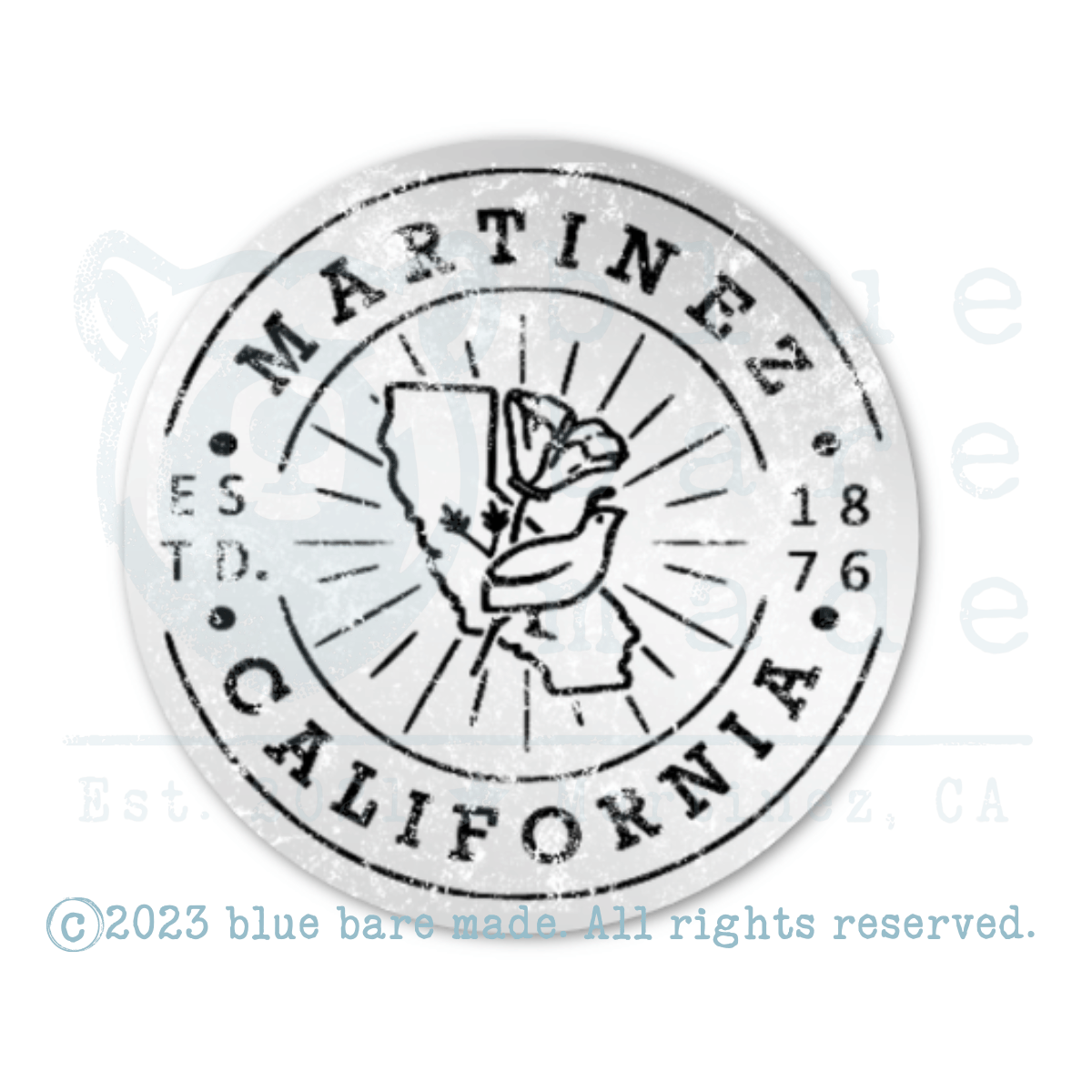 Durable distressed style mirrored sticker features a fun take on the City of Martinez, CA and the State of California with a poppy, quail and CA state outline in the center, and is an original copyrighted Blue Bare Made design.