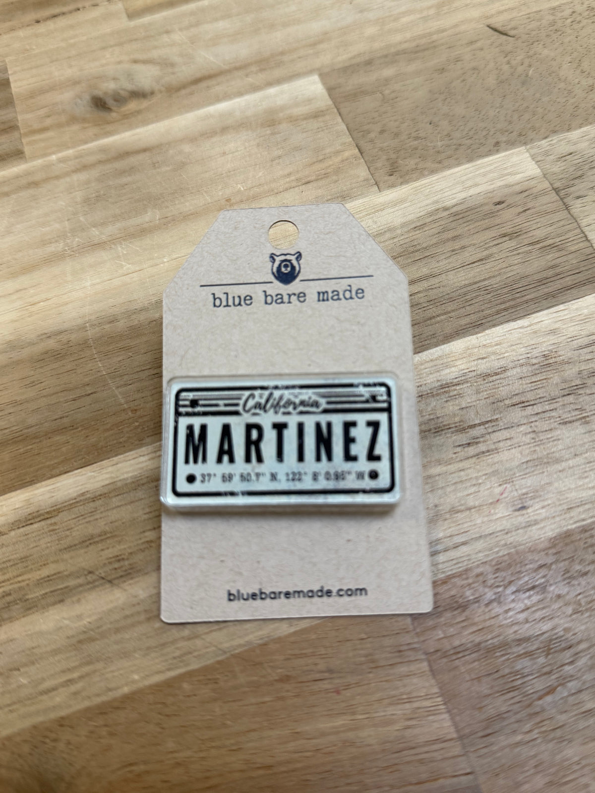Show off some local pride with this fun Martinez license plate lapel pin! Crafted from sturdy, clear acrylic, each pin measures 1 x 2" and features vibrant full-color printing. Made right here at Blue Bare Made, these original designs come with a soft PVC clutch that easily attaches to your jacket, backpack, or favorite gear for a playful pop of personality.