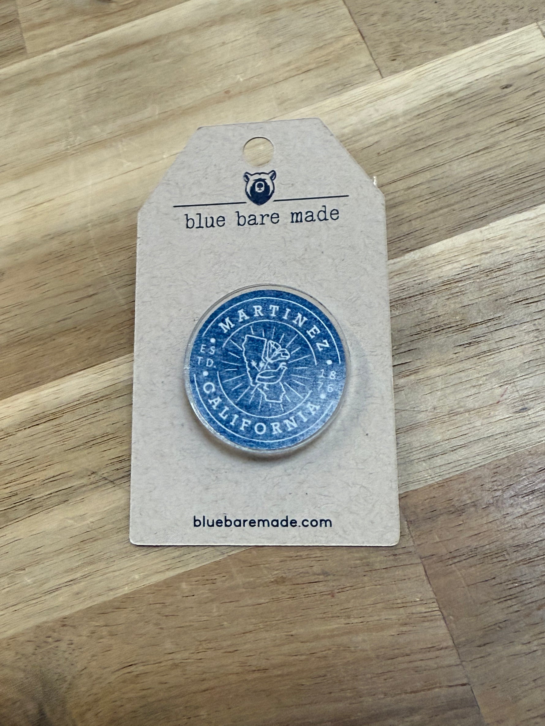 Show off some local pride with this fun Martinez round logo lapel pin! Crafted from sturdy, clear acrylic, each pin measures 1 x 2" and features vibrant full-color printing. Made right here at Blue Bare Made, these original designs come with a soft PVC clutch that easily attaches to your jacket, backpack, or favorite gear for a playful pop of personality.
