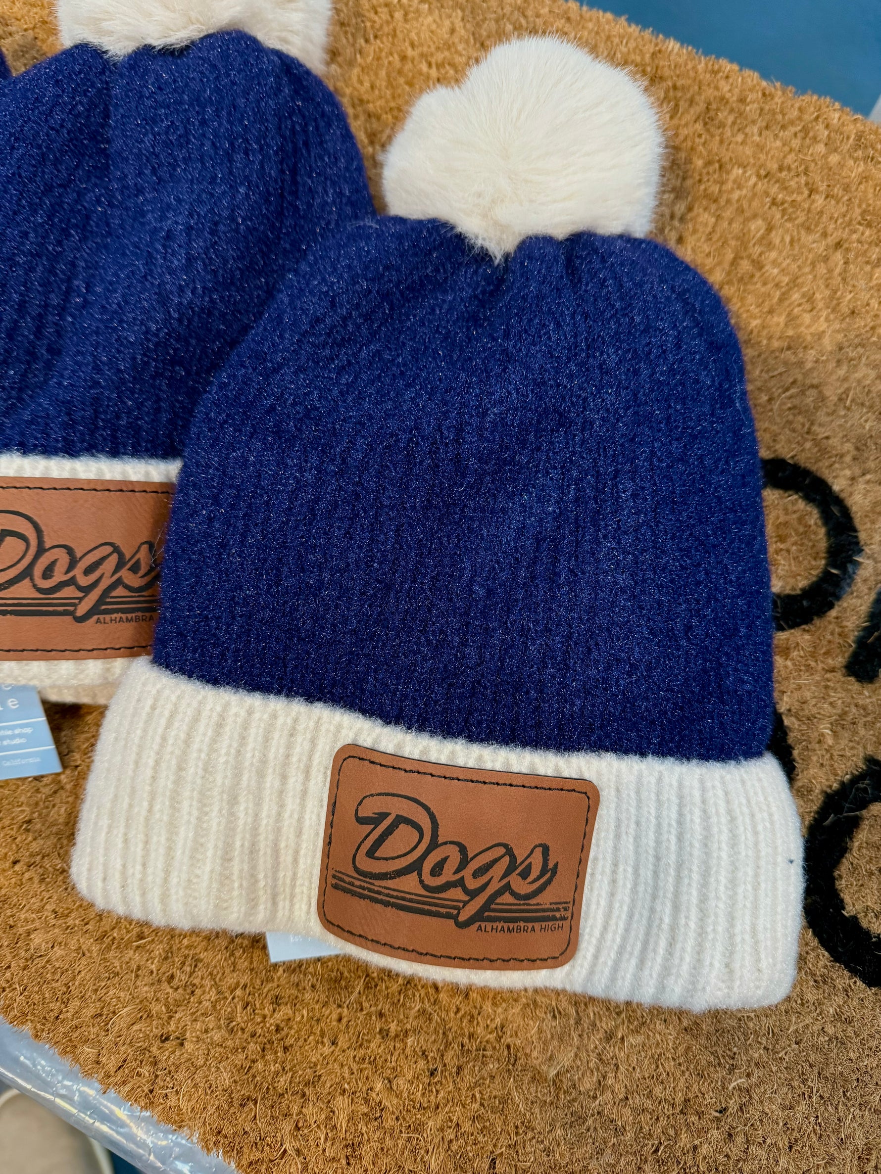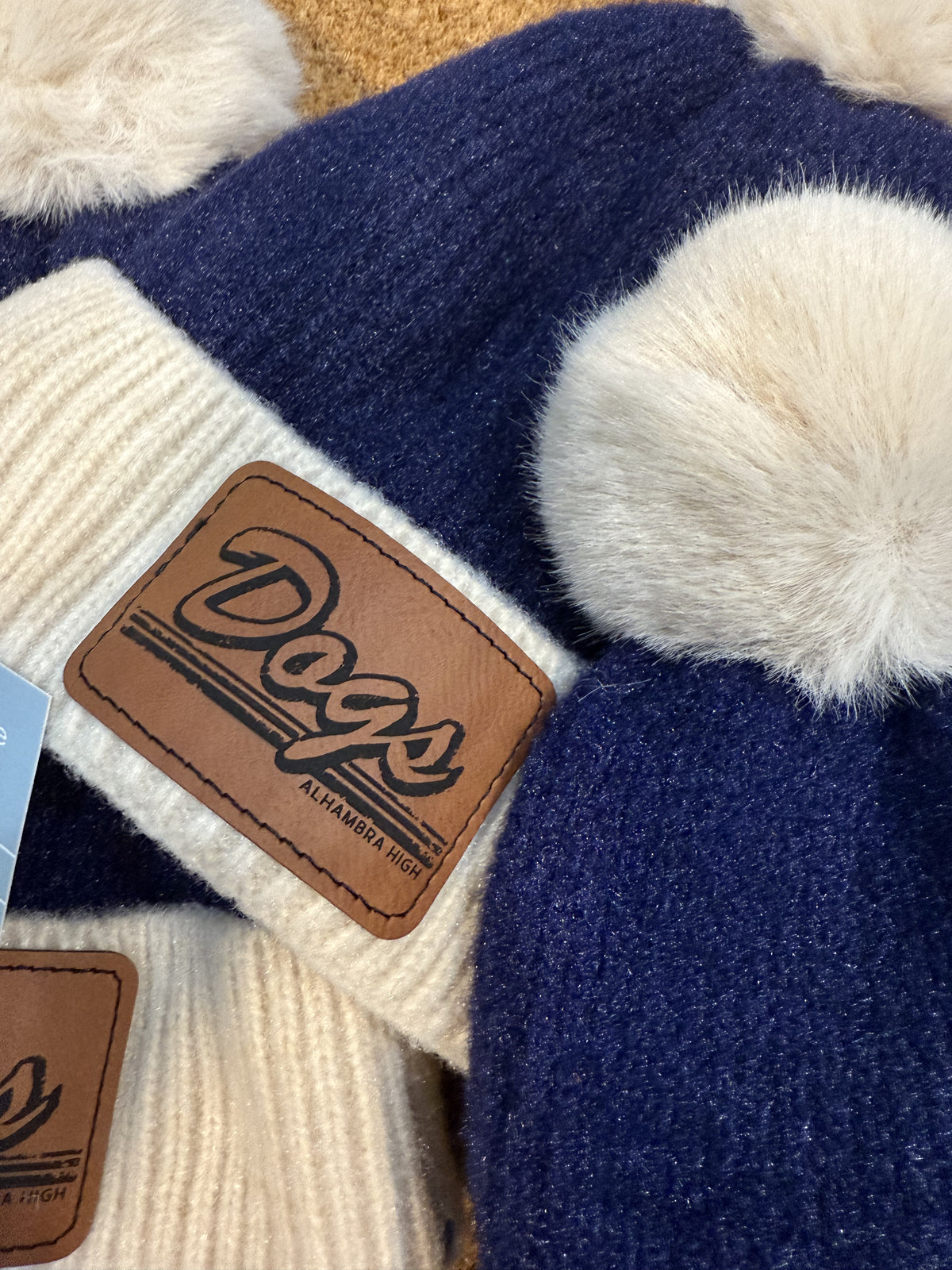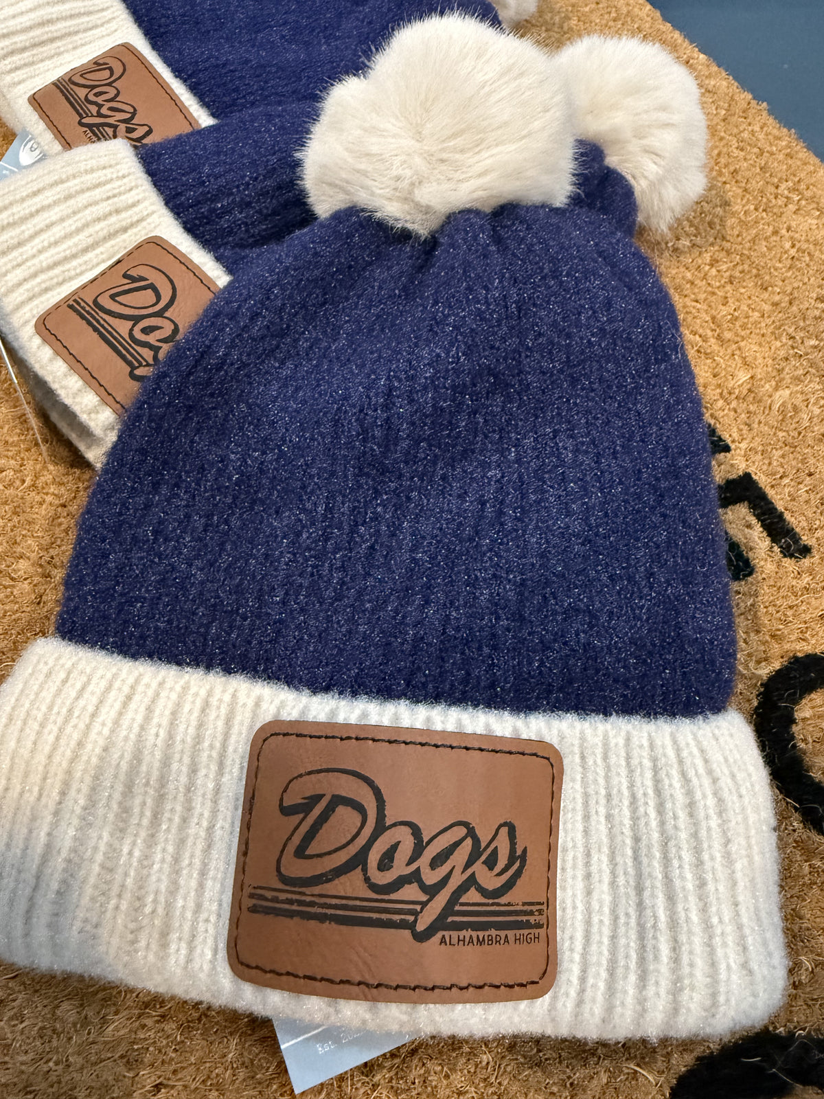 These fully lined cozy beanies are the perfect accessory to wear to AHS games. Features a vintage dogs logo vegan leather patch.