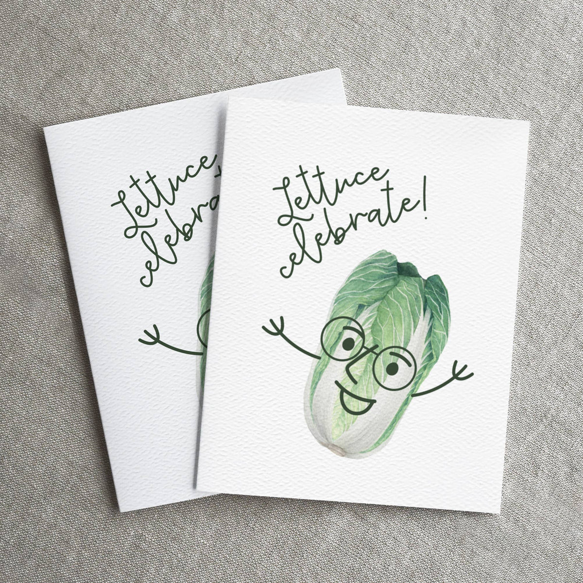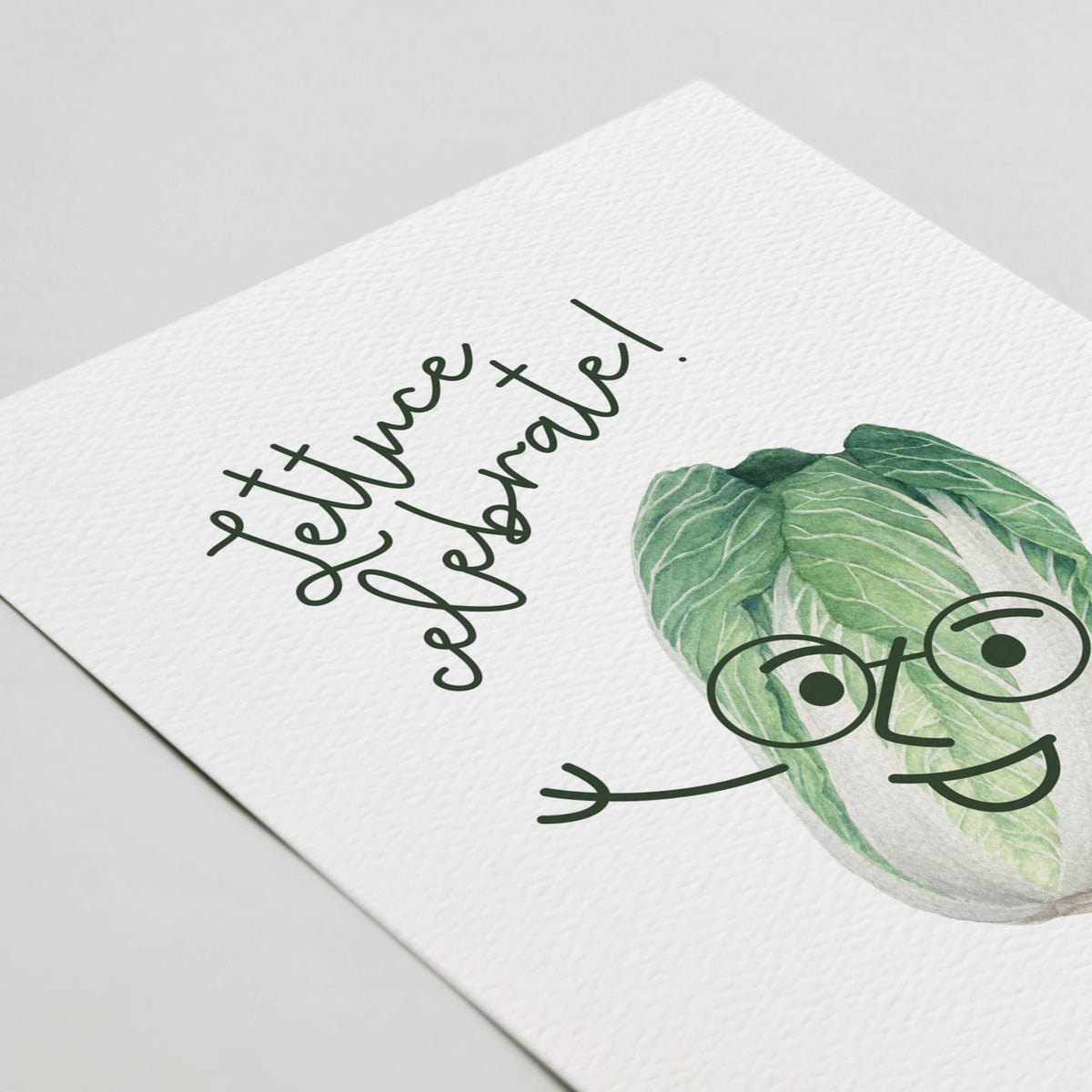 This funny lettuce pun card makes an excellent graduation or birthday gift. Card says: Lettuce celebrate!