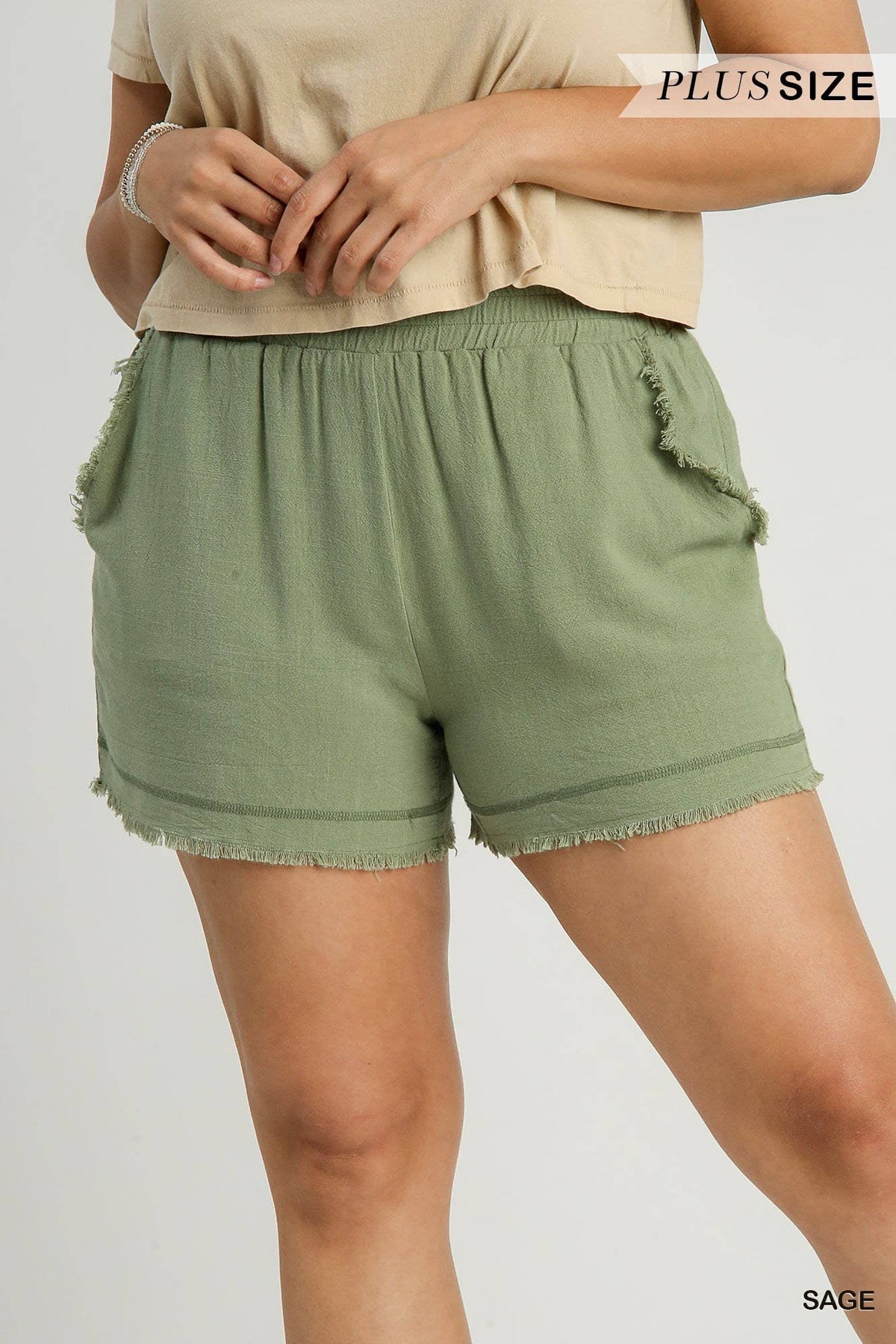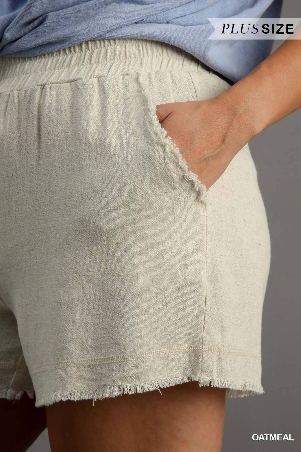 Curvy Linen Shorts with Elastic Waistband Fray Details
