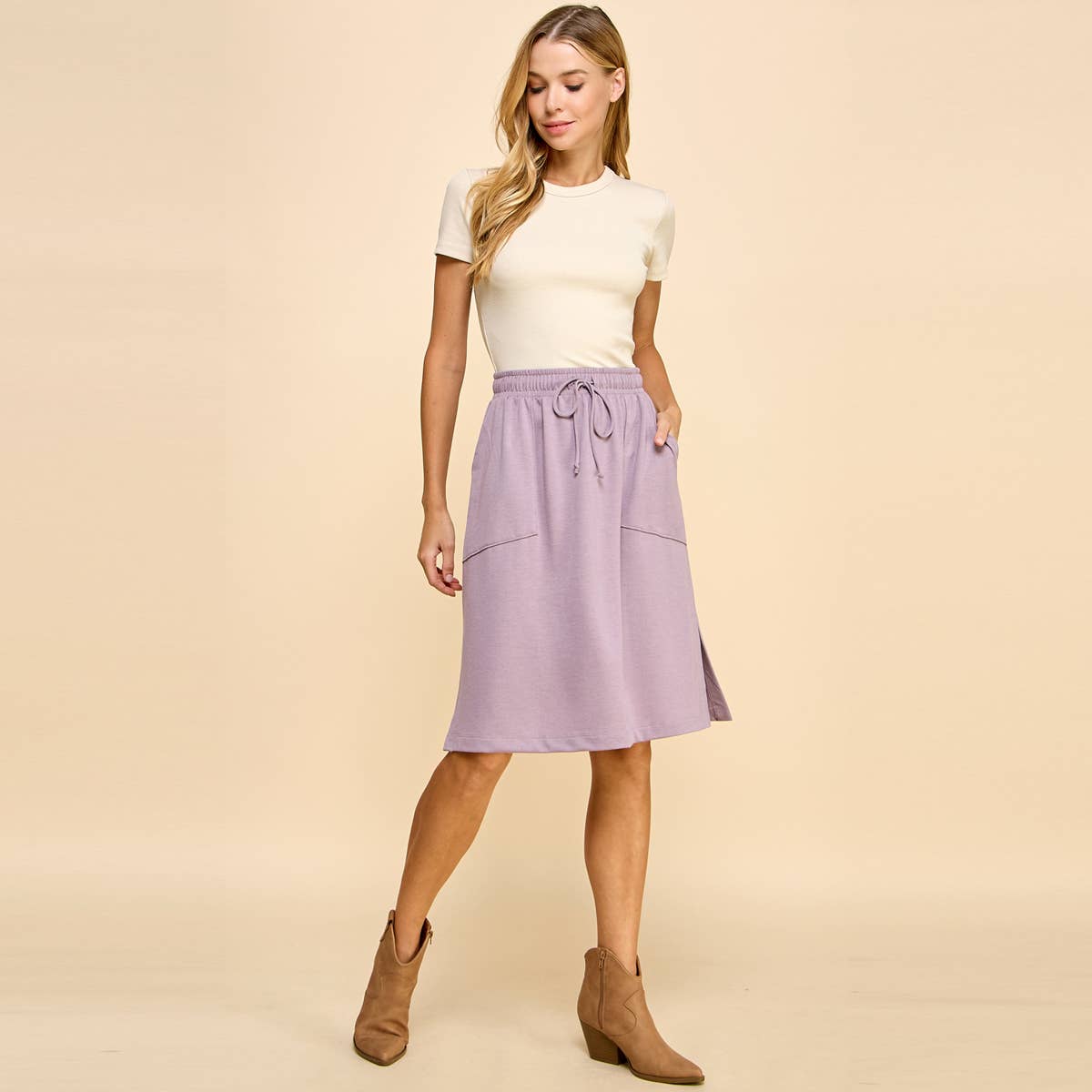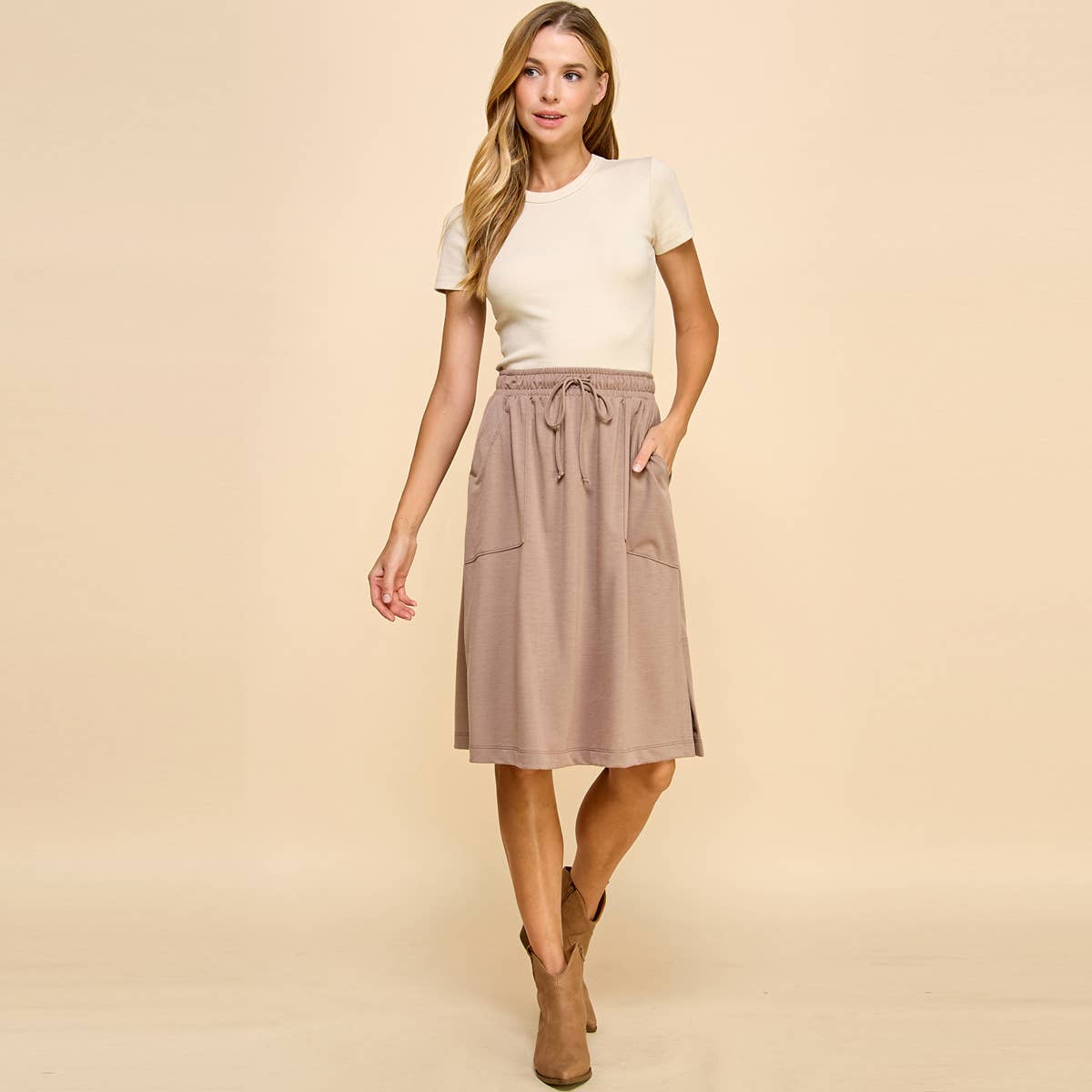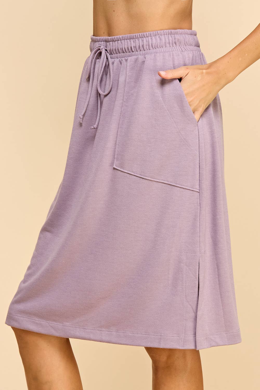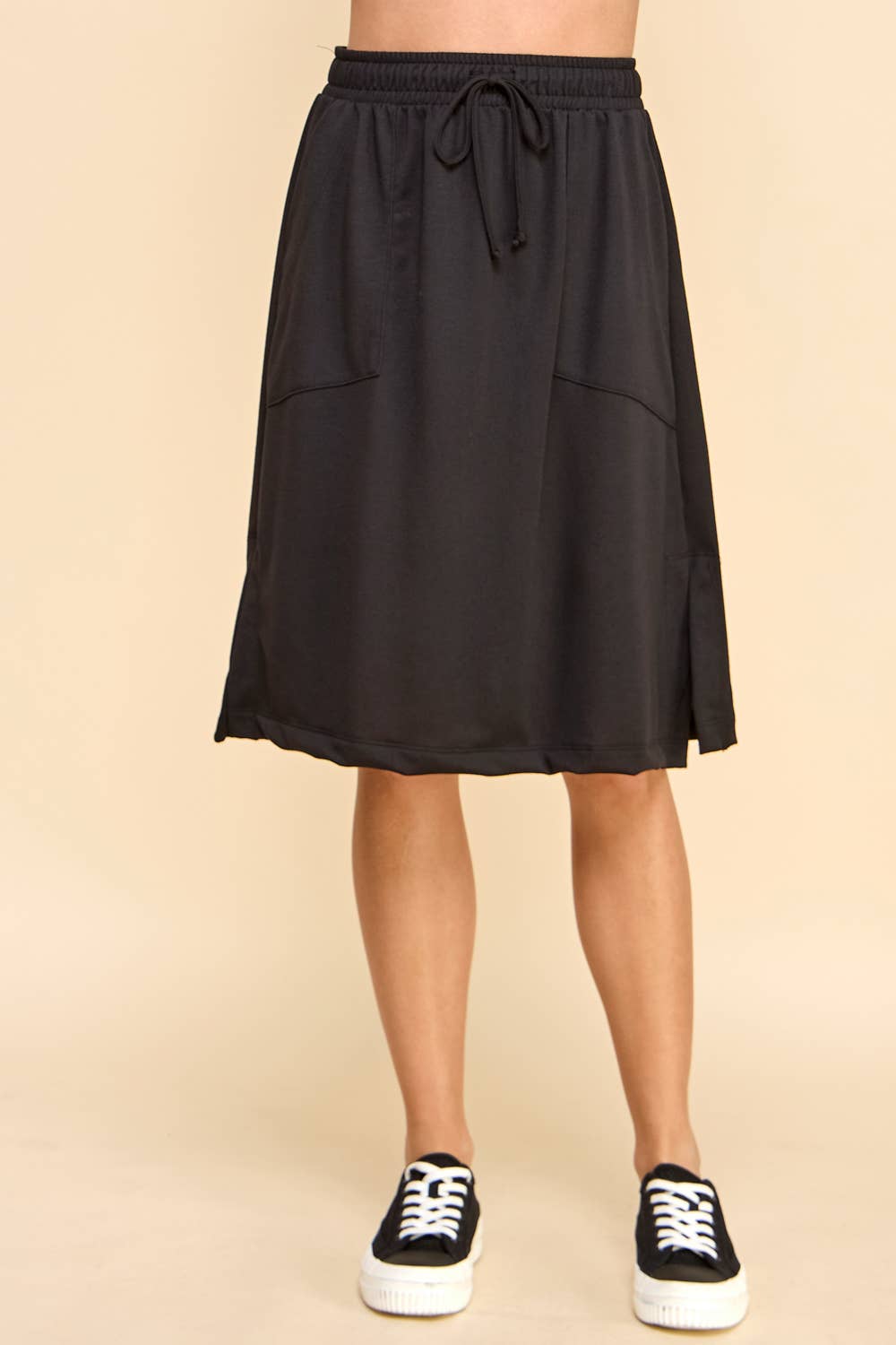This solid-colored knit cotton skirt is designed with practicality and style in mind. It features a flattering waist tie that accentuates your figure, providing a customizable fit. The skirt also includes convenient side pockets, perfect for holding small essentials. Made from comfortable fabric, it's ideal for both casual and semi-formal occasions.