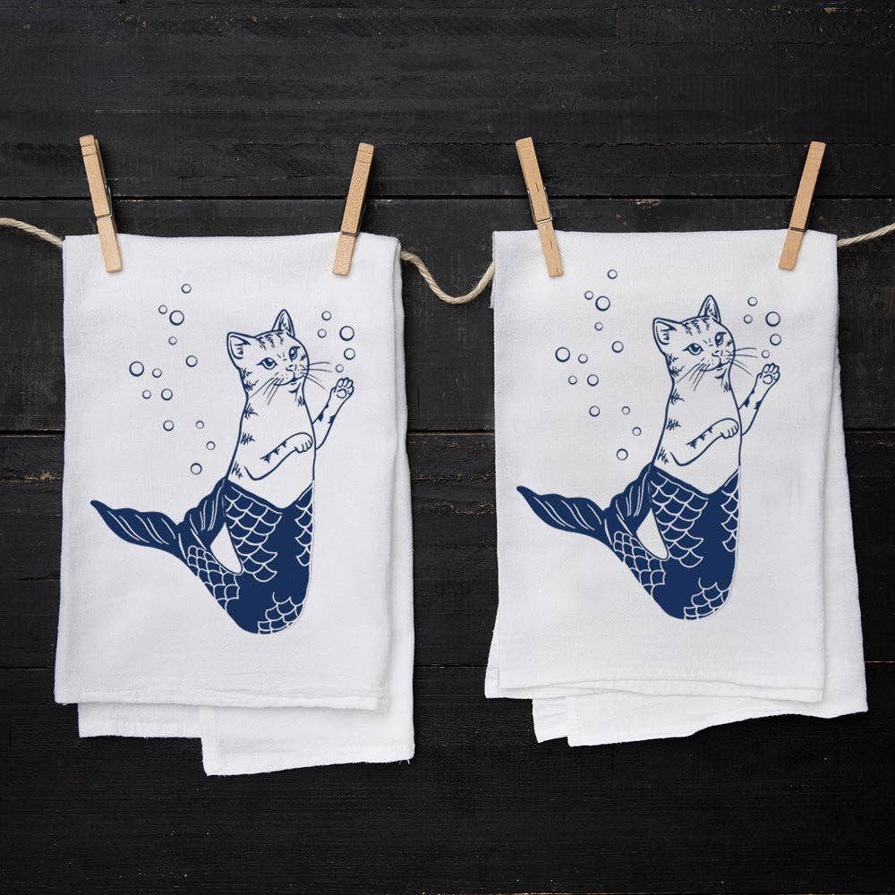 You will love the look and feel of our screen-printed Cat Mermaid Kitchen Towels. Our classic flour sack towels are super absorbent and dry glassware and dishes without leaving any lint. We only use the highest quality inks, so the print will not wash out or fade. Care instructions and more info: • 100% cotton flour sack tea towel • Towels measures approx. 28" x 29" • Image on middle-bottom-third of towel  • Packaged with an informative sticker • corner loop for hanging MADE IN THE USA. Counter Couture was founded by Kaelin and her husband Richard. We built Counter Couture out of a basic desire to live a creative and fulfilling life, with a bit of silliness tossed in. Every print starts as a pen and paper illustration drawn by us. These are: kitchen towels People also consider: tea towels, dish towel Perfect for: kitchen, tabletop linens, gifts for women, unique gifts, home decor, kitchenware, unique, handmade, teacher gifts, kitsch, christmas gifts