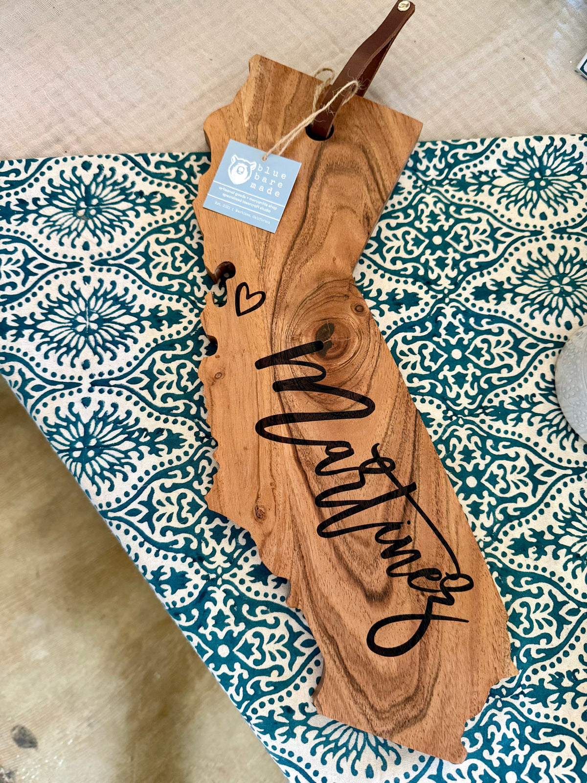 Celebrate your local pride with this custom Martinez engraved California serving board! Measuring 18” x 6.5” x 0.75”, this solid acacia wood board is engraved in the back of our shop with the name “Martinez” in elegant script and features a charming heart marking the Bay Area. It’s not just a cutting board—it’s a keepsake perfect for new homeowners, graduates, couples starting fresh, or anyone embarking on a new adventure out of state. Add a playful touch to your kitchen or gift it to someone special to remind them of home with every use.
