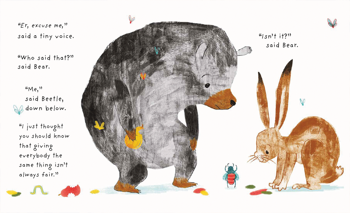 Bear and Hare try to reach some juicy pears, but they need some help. Hare finds three chairs, but is it fair that Hare has two chairs and Bear only one? When they have the same, Hare still can’t reach the pears! So a little friend teaches them that fair isn’t always everyone getting the same thing... with hilarious results! A beautifully simple picture book that considers, "what is fair?" The answer is not always as simple as you’d think!