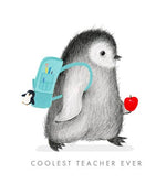 To thank all of the great teachers out there. Graphite penguin wearing a painted backpack and carrying a red apple text reads