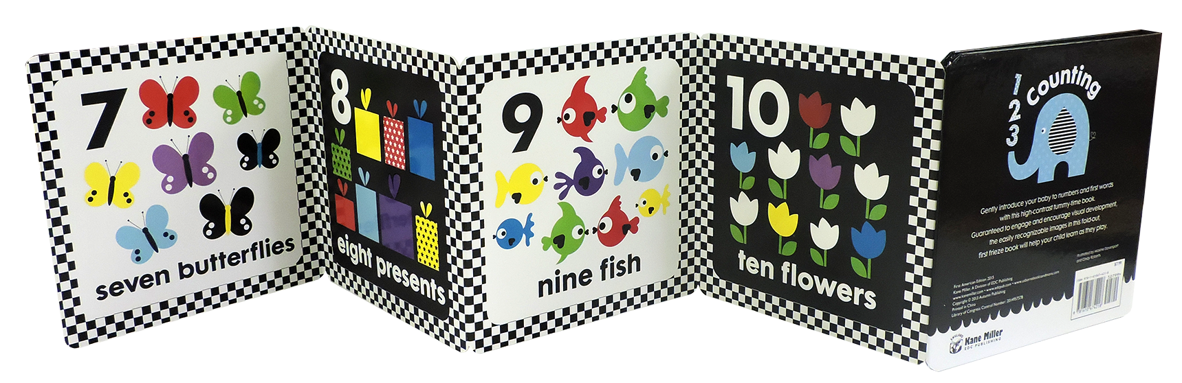 First Focus Frieze titles for babies are filled with panels of recognizable, high-contrast black and white images and patterns to aid visual development in the early stages. Gently introduce your baby to numbers and first words with this fold-out, stand-up books, perfect for tummy time!