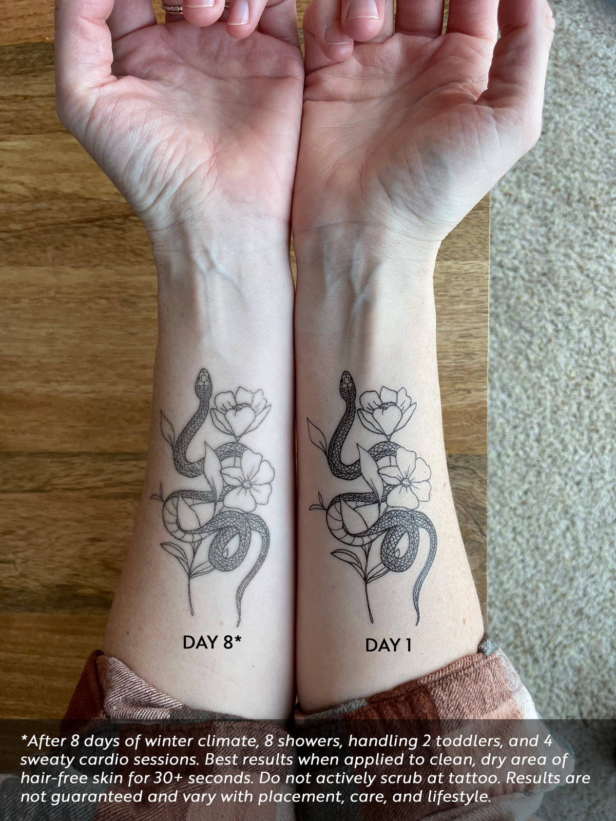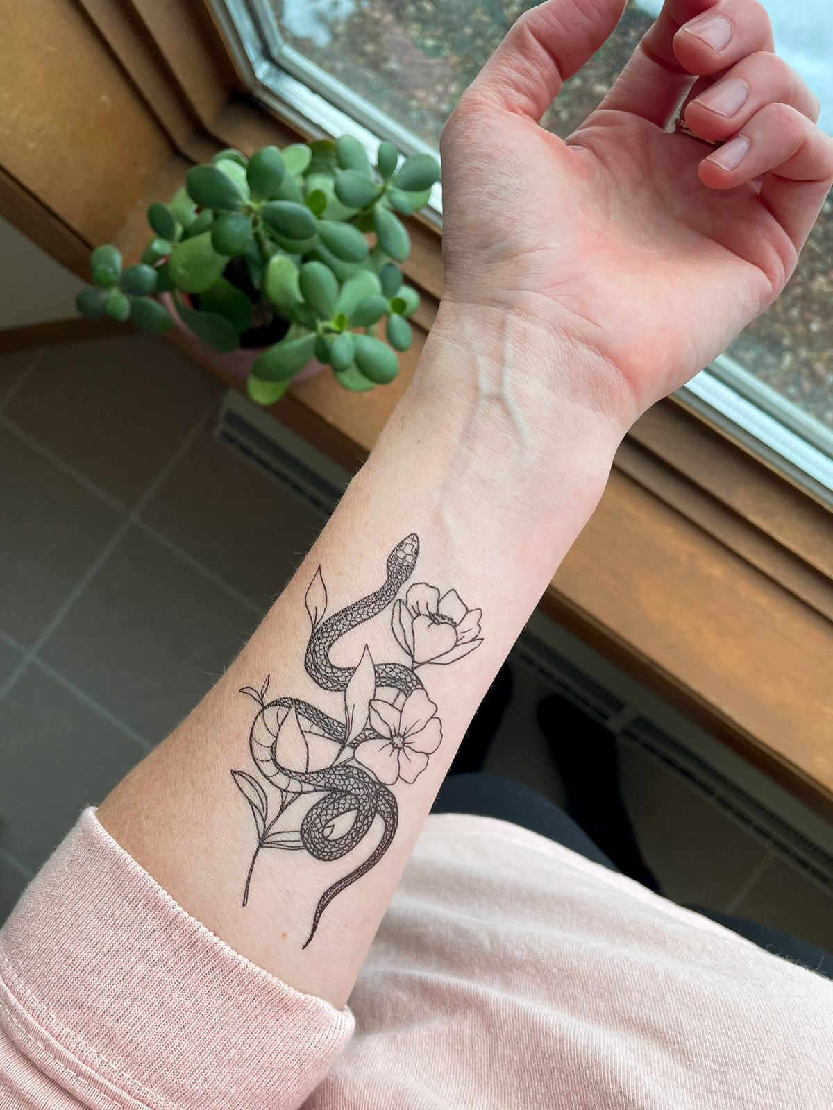 Featuring a hand-drawn garden (garter) snake slithering through poppy flowers. This temporary tattoo makes a thoughtful small gift or a pain-free way to try out a tattoo!