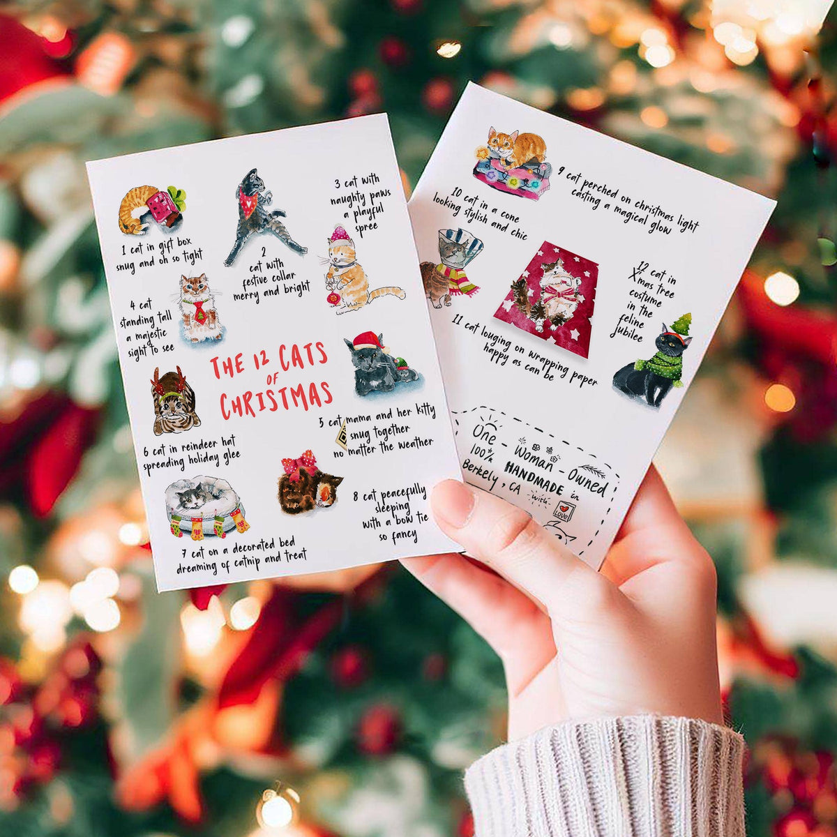 Experience '12 Nights of Christmas' with 12 playful cats in festive feline flair, accompanied by a charming poem. The ultimate funny Christmas card for cat enthusiasts. Get the 12-card pack for a purr-fect holiday treat.