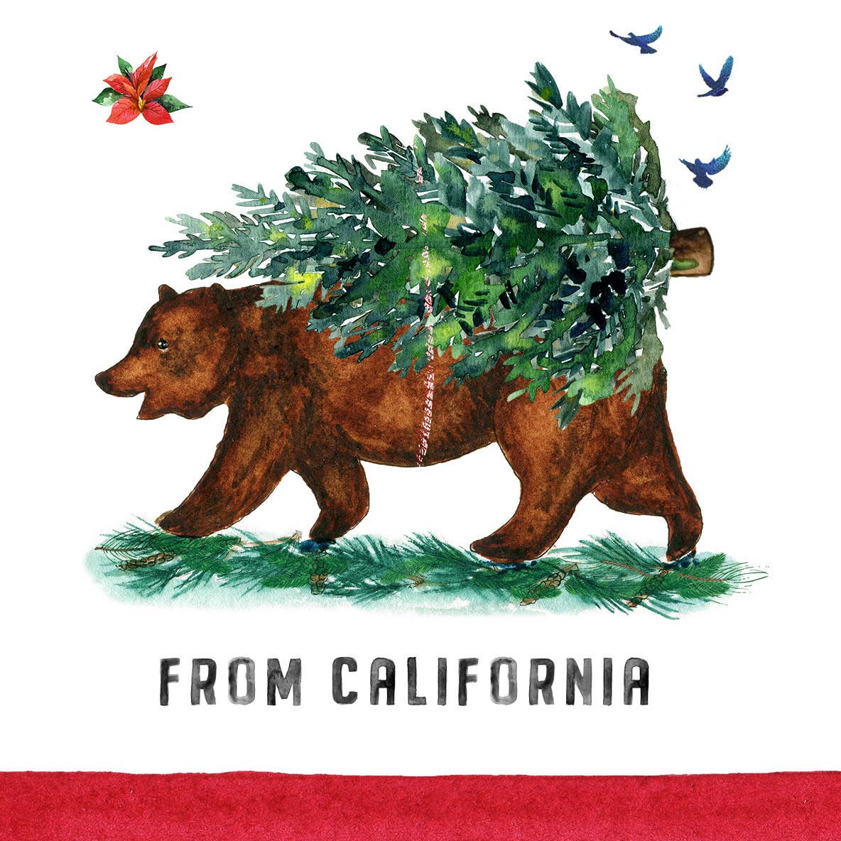 "Season's greeting from the California Bear. " The CA state flag themed winter holiday cards with a grizzly bear carrying Christmas tree to send best wishes to friends and family from California.