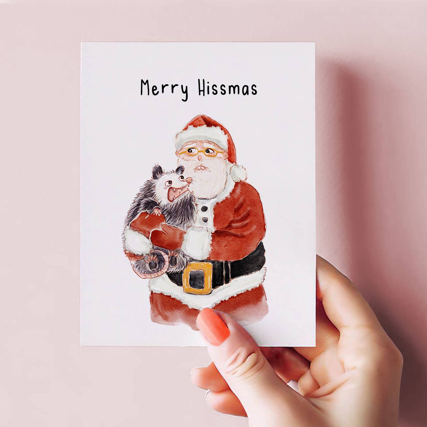"Merry Hiss-mas" - Where a screaming possum meets Santa! Spread holiday cheer with funny puns and a cute possum joke. Ideal for secret Santa gifts or stocking stuffers. -The illustration spans from the front to the back of the card. -A2 size (4.25" x 5.5"), blank inside -Luxury heavyweight eco-friendly paper -Single card & envelope in clear cello bag or plastic-free packaging -Handmade in Berkeley, California, USA