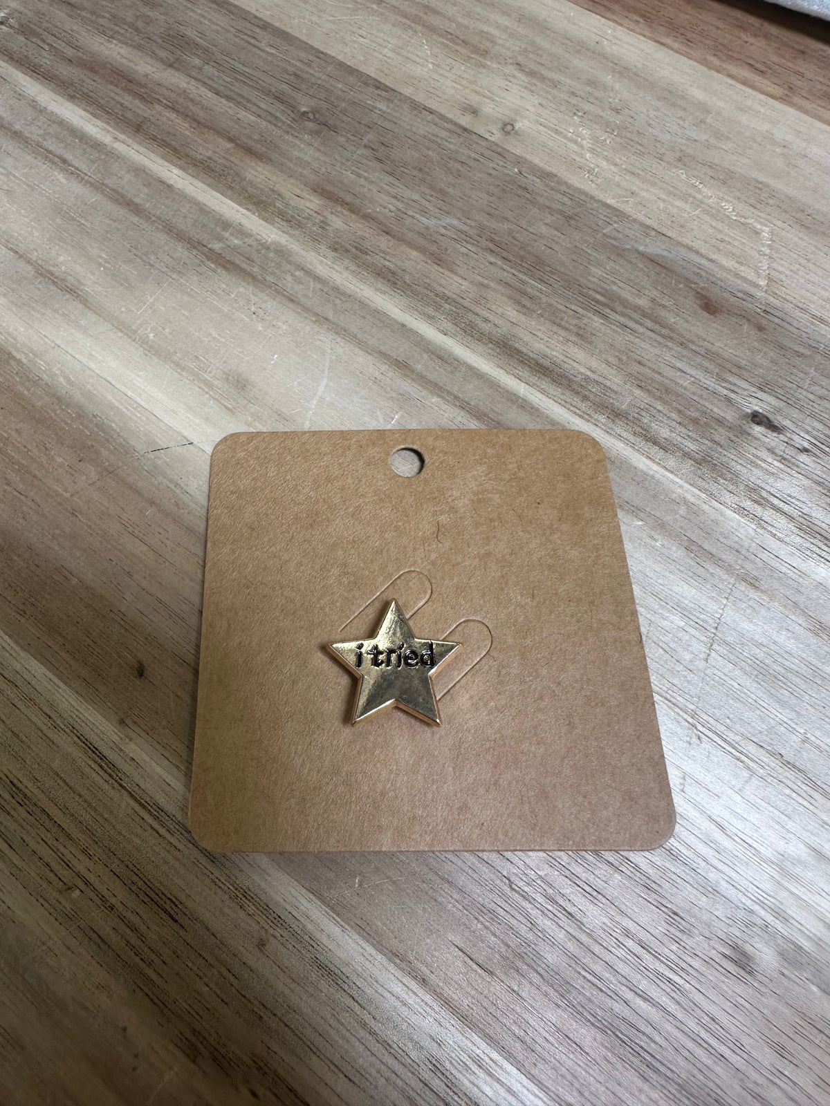 Celebrate effort with a playful twist! The "I Tried" gold star pin is a fun accessory that adds humor and charm to any outfit. Perfect as a lighthearted gift, it’s a cheeky way to acknowledge attempts, big or small, with a touch of sparkle. Wear it proudly or share it with someone who deserves a smile.