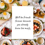 This 'Friends Forever, You Know Too Much Funny' tea towel is a low maintenance tea towel for high maintenance messes. Our tea towels are: *100% cotton *Handprinted in Missouri *Printed with durable specialty inks *Pre-washed and shrinked *Approx 28" x 28" *White with a hanging loop Green Bee Tea Towels was founded by Rena in 2015 to provide products that are not only fun and beautiful but that are also functional and durable. Our tea towels require no special care, the care instructions are as follows: *Machine wash - warm water *Tumble dry - low *Iron & bleach optional Due to the handmade nature of our tea towels, each will have slight variations in size, texture and image placement. People also search: Dish Towel, Dish Cloth, Gift From Love, Pink And Grey Tea Towels, Mom Towel, Happy Land Gifts, Christmas Gift Perfect for: Homeware, Giftware, Designer Tea Towels, Cotton Tea Towels, Boutique And Gift Shop, Mom Tea Towel, Us Gift Store, Gift Chateau